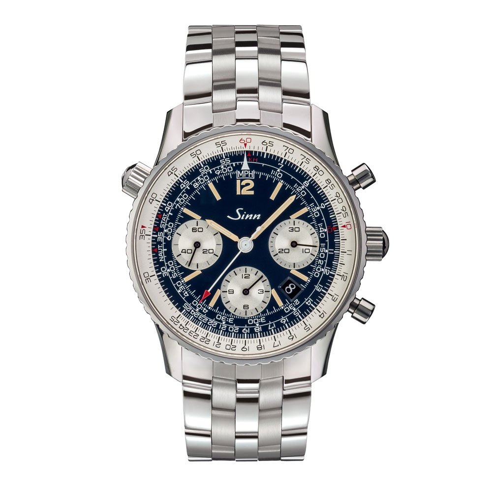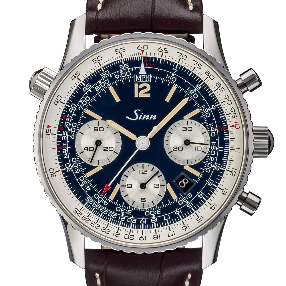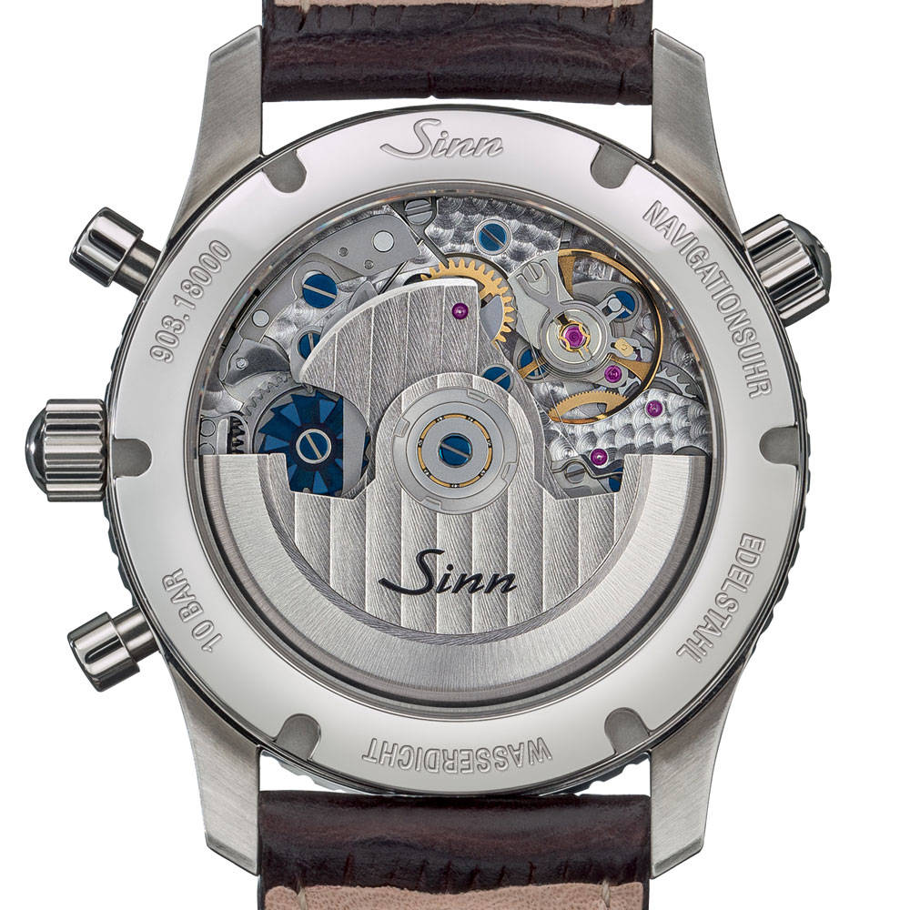 発売以来、そのベースデザインを変更せず、ジンのクロノグラフの中でも特別なモデルとして人気を博してきた903.ST.AUTOに登場した最新ダイヤルです。多種多様な機能に加えて、この903.ST.AUTO.B.Eは夜光処理を施したアイボリーカラーの時・分針とインデックスを備えた機能性の高いダークブルーのダイヤルが特徴です。ディテールを見れば、機能が使いやすく明快に配置されていることがわかります。そして電子計算機がポピュラーになる以前の計算尺と同様のシンプルな方法で計算を可能にしたもので、クラシックなアナログ計算尺を使って楽しむ人にとっては最適なクロノグラフといえます。一般的な掛け算、割り算はもちろん、ナビゲーターに必要な燃料消費量、速度、距離、時間などの便利な計算が可能です。サファイアガラスによるシースルーバックで、コラムホイールを搭載したラ・ジュー・ペレのムーブメントの動きを楽しむことができます。