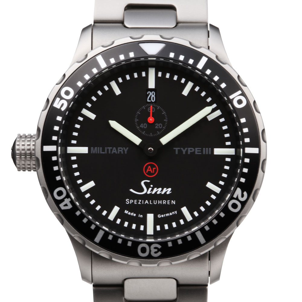 ミリタリーシリーズは、視認性を追及し無駄を排除したジンの第2世代のミリタリーウォッチです。第二弾はシリーズ初の三針タイプ。時・分表示の視認性を高めるため、秒針はスモールセコンドとし、モデル名を示す“MILITARY TYPE III”という文字もグレーで控えめにデザイン。12時位置の秒表示は赤い針を採用することで小さいながらも見やすく、ジンらしいはっきりと太いインデックスで視認性が抜群のダイヤルデザインとなっています。さらに操作性を考慮し時計の左側に配置したリューズなど、ジンが誇る高性能なミリタリーウォッチとなりました。日本でのみ300本の限定です。