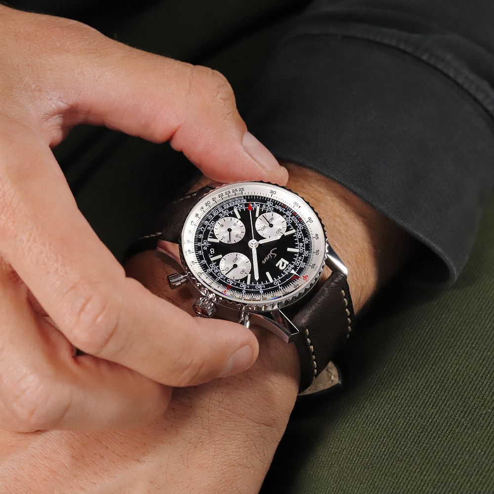 ジンのコレクションにおいてナビゲーション・クロノグラフの数十年にわたる伝統を刻み込んでおり、対数目盛りを備えた計算尺ベゼルは、時間、距離、燃料消費量の計算に使用できます。特筆すべきは、手作業で丁寧に取り付けられたインデックスや、12の数字、時分針にハイブリッド・セラミックの夜光塗料を使用していることです。高濃度の夜光塗料をそれぞれのハイブリッド・セラミックに使用するという革新的な方法により、極めて高い輝度と暗闇での完璧な視認性を実現しています。