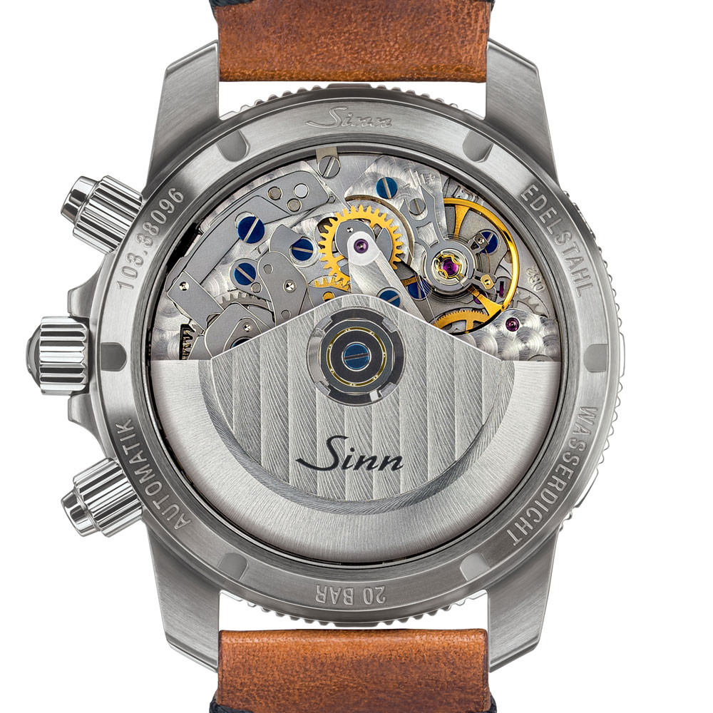 モデル「103.B.SA.AUTO」の両方向回転式のブラックカラーベゼルは、60年代にドイツ空軍クロノグラフとして制式採用されたモデル155の伝統を踏襲しています。ステンレススチール製ケース、ねじ込み式リューズ、ねじ込み式裏蓋など必要最小限のスペックを備えた103シリーズの基本モデルにサファイアガラスの風防とねじ込み式のプッシュボタンを装備した、ハイスペックなパイロットクロノグラフです。2018年より時計内部を乾燥した状態に保ち風防の曇りを防止するArドライテクノロジーが標準装備となりました。