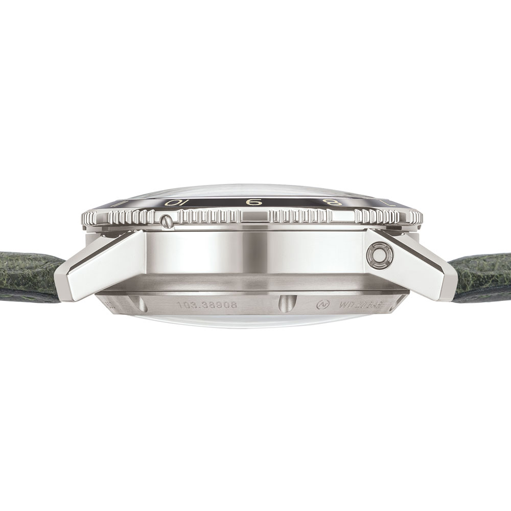 さらに、ブランドの記念日を祝うため、光沢のあるブラックダイヤルには「Sinn」という文字とともに、ジンの本拠地でありこの時計の生産地でもある「フランクフルト・アム・マイン」の文字が記されています。シースルーバックの裏蓋には、限定番号のほか、「1961-2021」の文字と60周年を意味するドイツ語の「60 JAHRE」の刻印が施されています。103.KLASSIK12には、標準装備のダークグリーンのワイルドボアレザーストラップのほかに、ブラックの型押しカウレザーストラップ1本と、60周年記念パッチが付属されます。