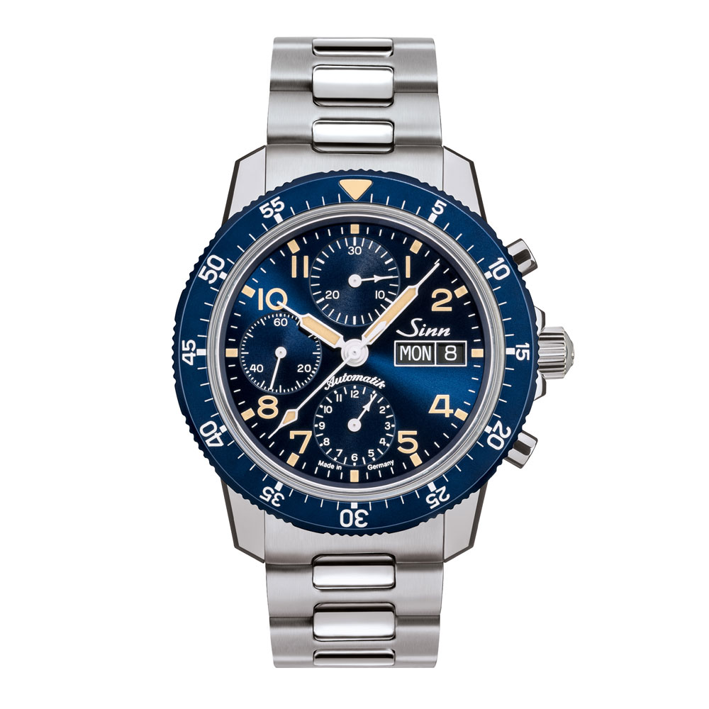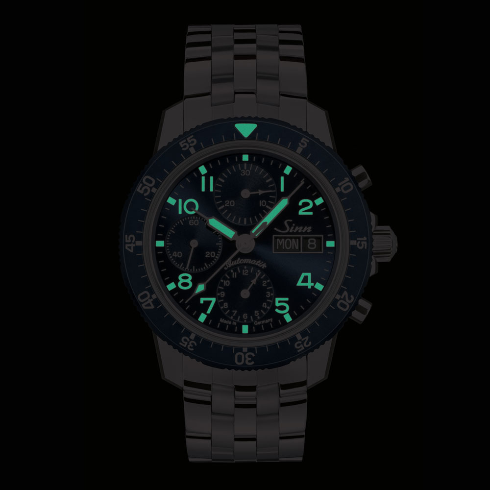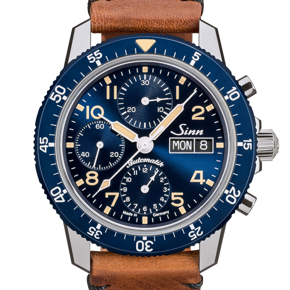 この時計は、象牙色の夜光処理を施した針やインデックスにより、歴史的なパイロットウォッチを想起させるクラシックなスタイルを持ったクロノグラフで、その効果はクラシックブルーでさらに強まります。サンレイ仕上げを施したダイヤルと、陽極酸化アルミ製のパイロットベゼルの両方にこのブルーを使用するのは、ジンの時計の中でも初めてのことです。もうひとつの特徴であるドーム状の曲面サファイアクリスタルのフォルムは、従来のアクリル風防に似ています。この5種類の異なる曲率半径を持ったサファイアクリスタルは、厚さ5mmのソリッドガラスから切り出され、このために特別に製作された工具を使用して慎重に研磨されます。この複雑な工程を経ることで、古典的な外観を高めるだけでなく、従来のフラットなガラスに比べ弾力性に富んだものになります。このモデルは世界500本の限定で、サファイアクリスタル製の裏蓋から見えるローターには、”Eine von 500(500本のうちの1本)”というドイツ語が刻印されます。