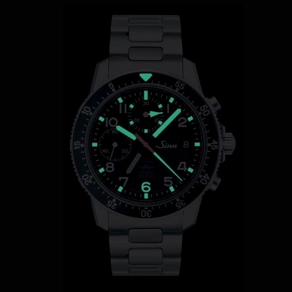 2016年3月に発効されたドイツ工業規格のパイロットウォッチの新規格DIN8330に準拠したクロノグラフです。計器飛行方式(IFR)での航空のために、機能性、信頼性、安全性において高い要求をクリアし、ハンブルクにある認証機関SEACOTEC社によりテスト・認定されています。コックピット内の時間計測機器が故障またはその疑いがあるときに代替できるものであり、航行中の物理的負荷に悪影響を受けず、他の航空計器と互換性があることが保証されます。このモデルには12時間表示式の第二時間帯表示が搭載され、Arドライテクノロジーやジン特殊オイルの採用により、プロの使用にも相応しいパイロットウォッチとなっています。