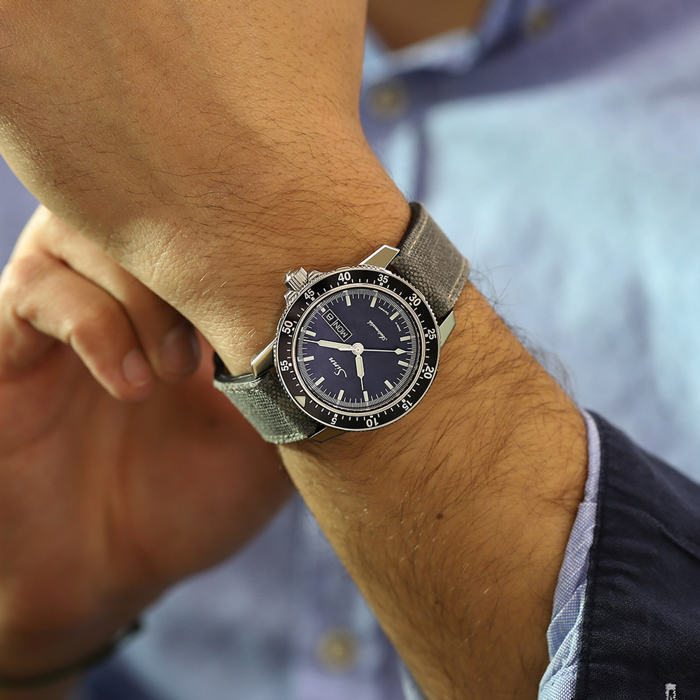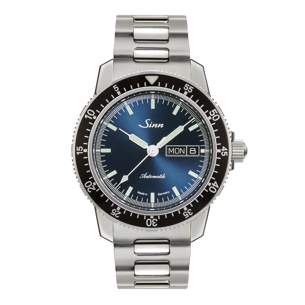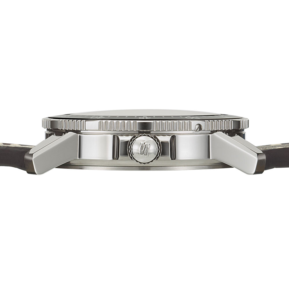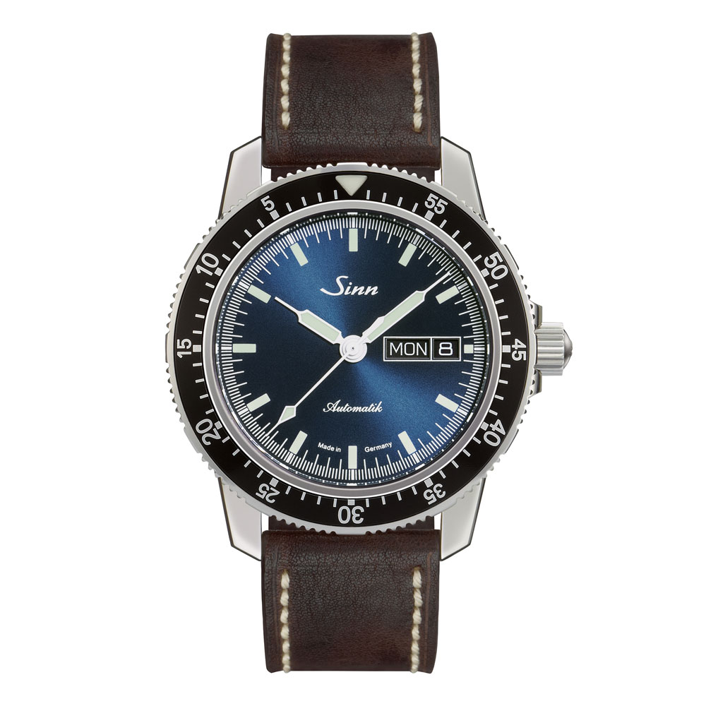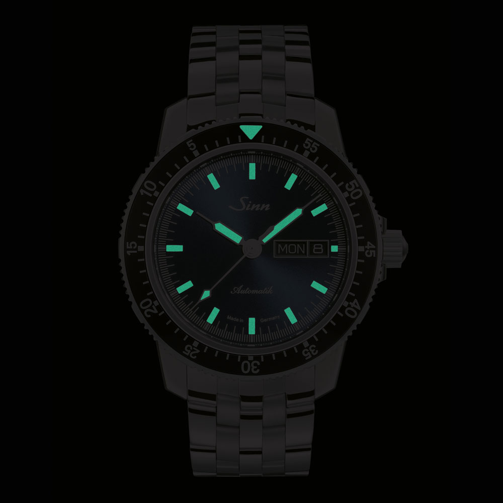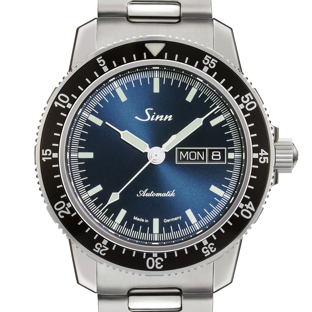 サンレイ仕上げが施されたダークブルーダイヤルを備えた104.ST.SA.IBは、光によってその青みを変化させ、ニュアンスのある光をたたえます。ポリッシュ仕上げのステンレススチール製ケースに、両面無反射コーティングを施したサファイアクリスタルを搭載し、シースルーバックの裏蓋からはムーブメントの動きを鑑賞することができます。分表示を刻んだパイロットベゼルは両方向回転式で、通常のスナップ式とは異なるジン独自の確実な装着方法で取り付けられているため、不意の衝撃でも外れることはありません。ベゼルの12時位置には三角形の夜光マークも付いた伝統的なデザインです。20気圧防水と減圧耐性も備えています。