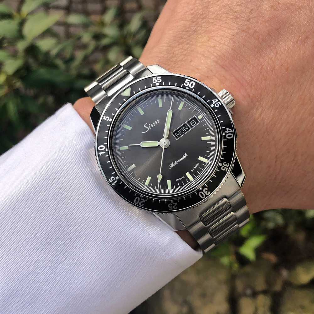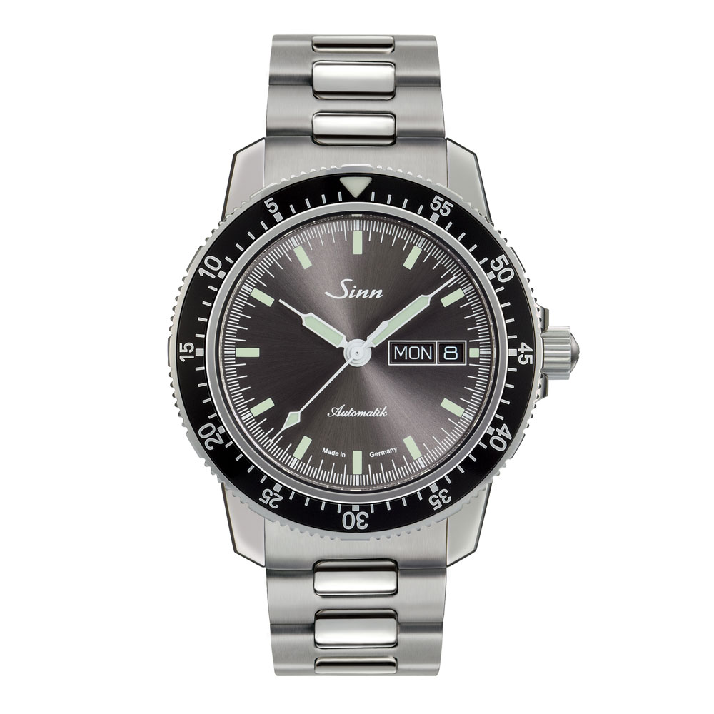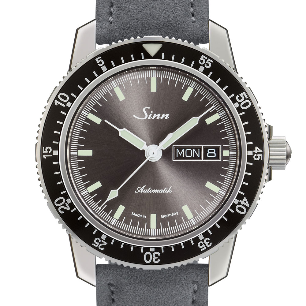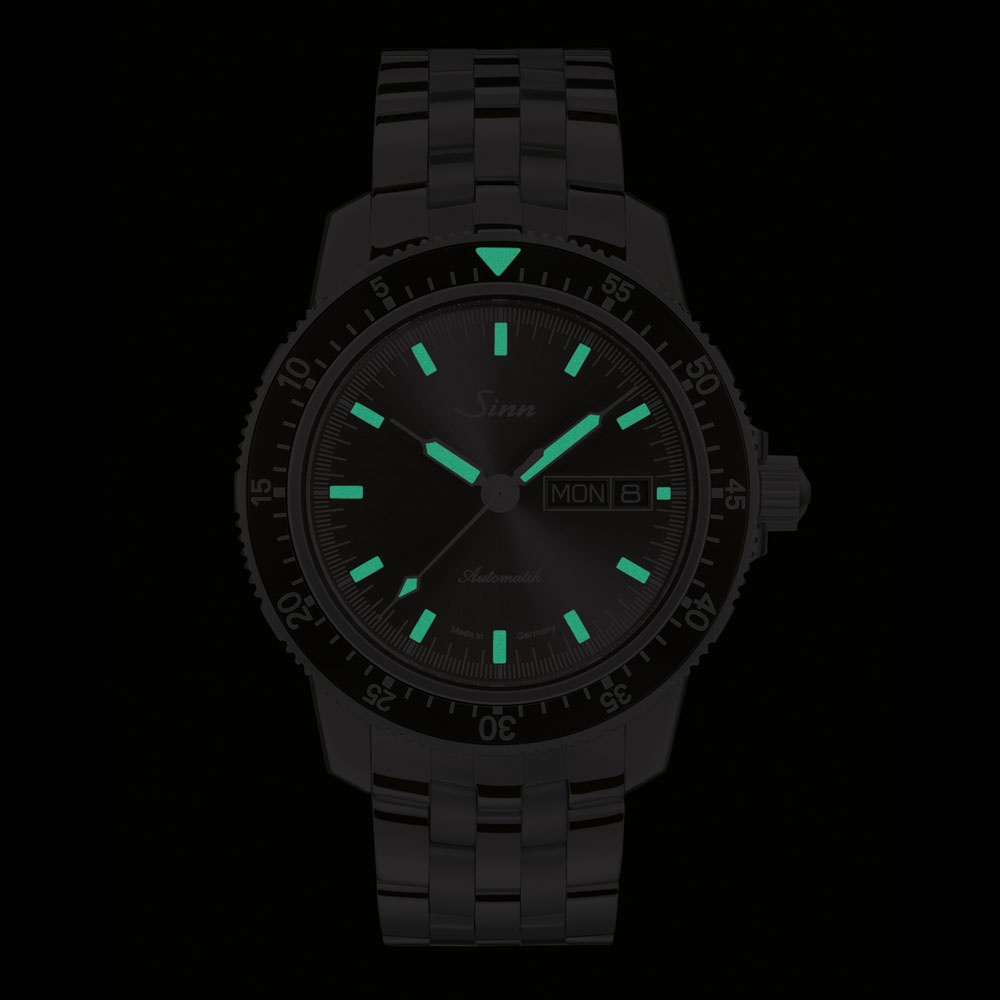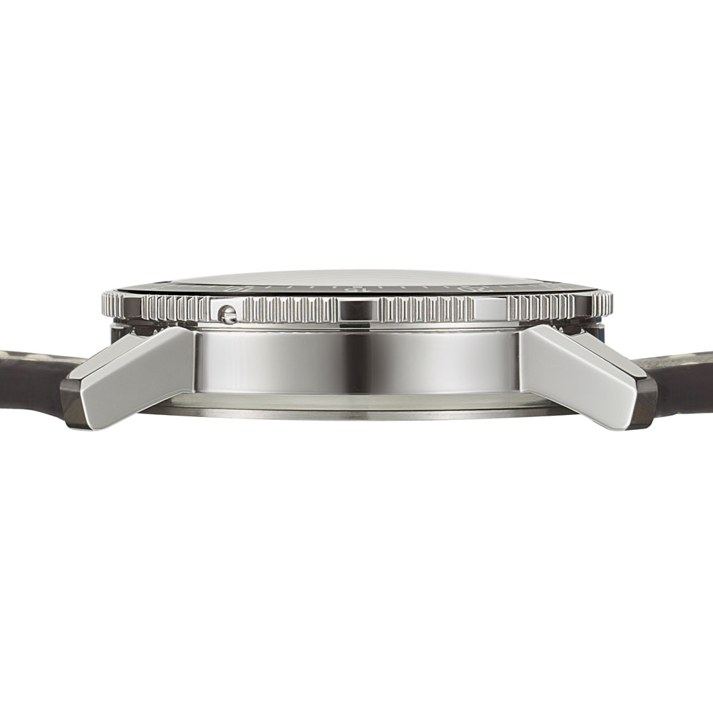 104.ST.SA.IAは、アンスラサイトの色味が独特で、サンレイ仕上げがこの時計の時代を越えた品格を際立たせています。ポリッシュ仕上げのステンレススチール製ケースに、両面無反射コーティングを施したサファイアクリスタルを搭載し、シースルーバックの裏蓋からはムーブメントの動きを鑑賞することができます。分表示を刻んだパイロットベゼルは両方向回転式で、通常のスナップ式とは異なるジン独自の確実な装着方法で取り付けられているため、不意の衝撃でも外れることはありません。ベゼルの12時位置には三角形の夜光マークも付いた伝統的なデザインです。20気圧防水と減圧耐性も備えています。
