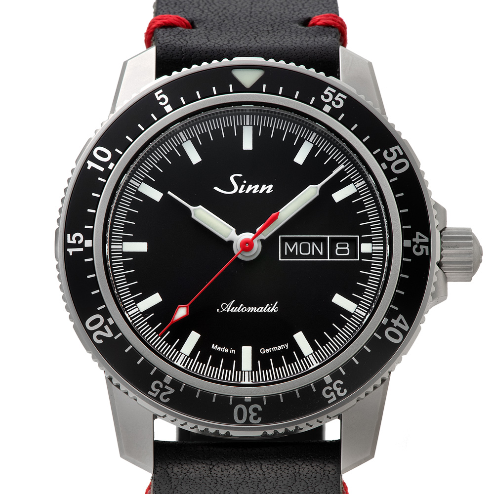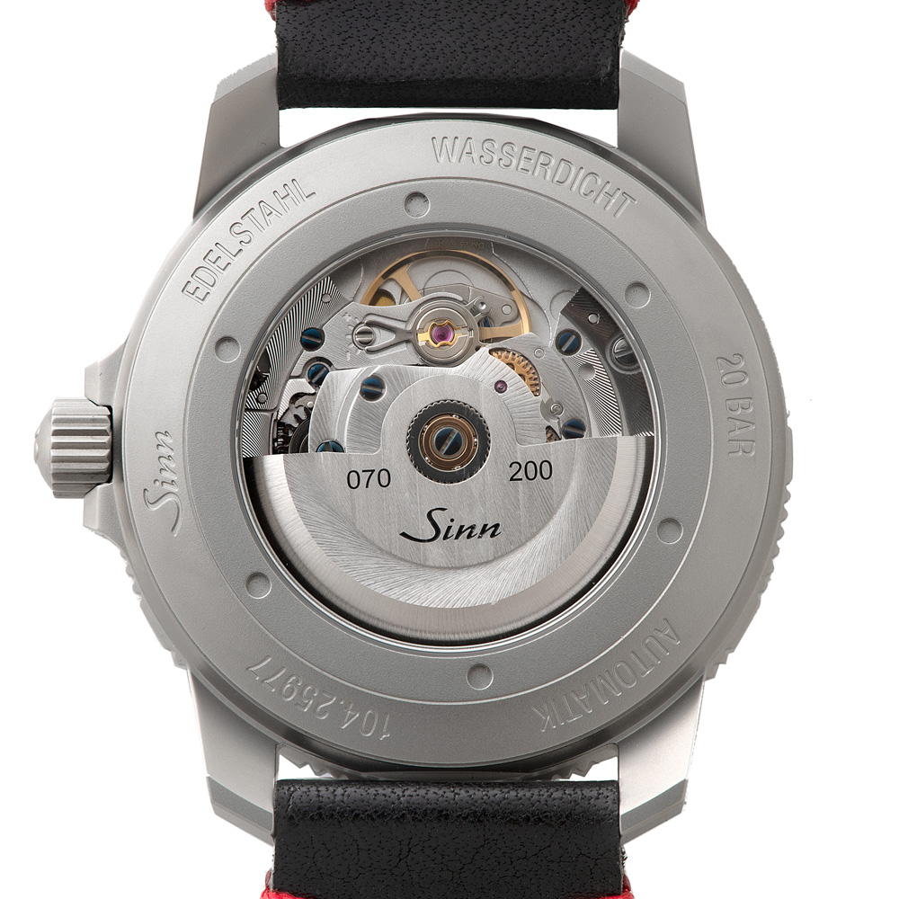 104.ST.SA.I.RS.Mは、ジンの基本精神に基づいて製作のパイロットウォッチ特別限定品で、時刻、日付や曜日、秒の最適な視認性を確保したモデルです。分表示を刻んだパイロットベゼルは両方向回転式で、通常のスナップ式とは異なるジン独自の確実な装着方法で取り付けられているため、不意の衝撃でも外れることはありません。ベゼルの12時位置には三角形の夜光マークも付いた伝統的なデザインです。時計ケースはマット仕上げ。サファイアクリスタルの風防と裏蓋もサファイアクリスタル製で、ムーブメントの繊細で複雑な動きを見ることができます。20気圧防水と減圧耐性も備えています。