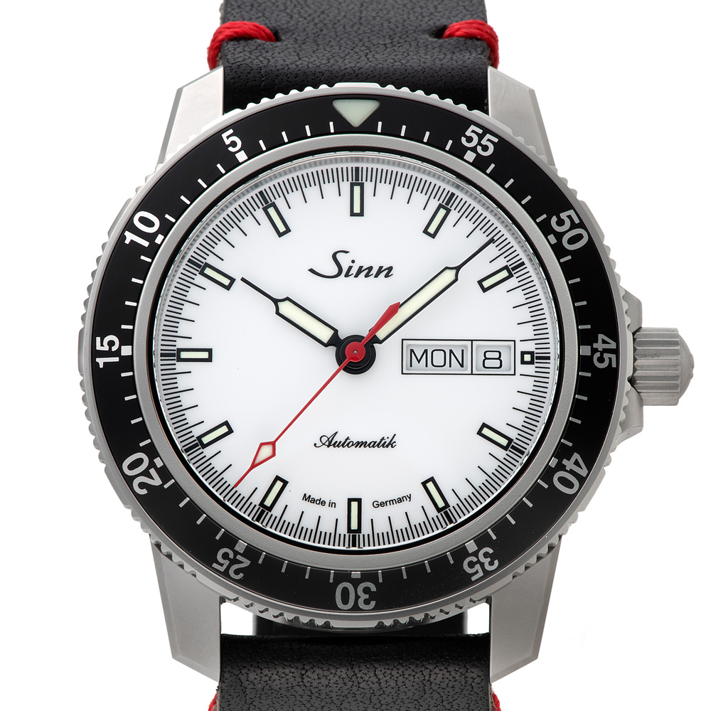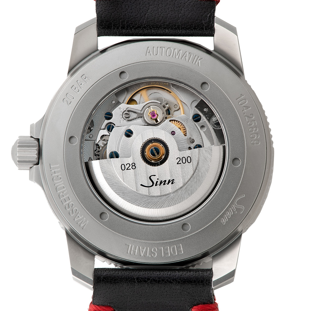 104.ST.SA.IW.RS.Mは、ジンの基本精神に基づいて製作のパイロットウォッチ特別限定品で、時刻、日付や曜日、秒の最適な視認性を確保したモデルです。分表示を刻んだパイロットベゼルは両方向回転式で、通常のスナップ式とは異なるジン独自の確実な装着方法で取り付けられているため、不意の衝撃でも外れることはありません。ベゼルの12時位置には三角形の夜光マークも付いた伝統的なデザインです。時計ケースはマット仕上げ。サファイアクリスタルの風防と裏蓋もサファイアクリスタル製で、ムーブメントの繊細で複雑な動きを見ることができます。20気圧防水と減圧耐性も備えています。