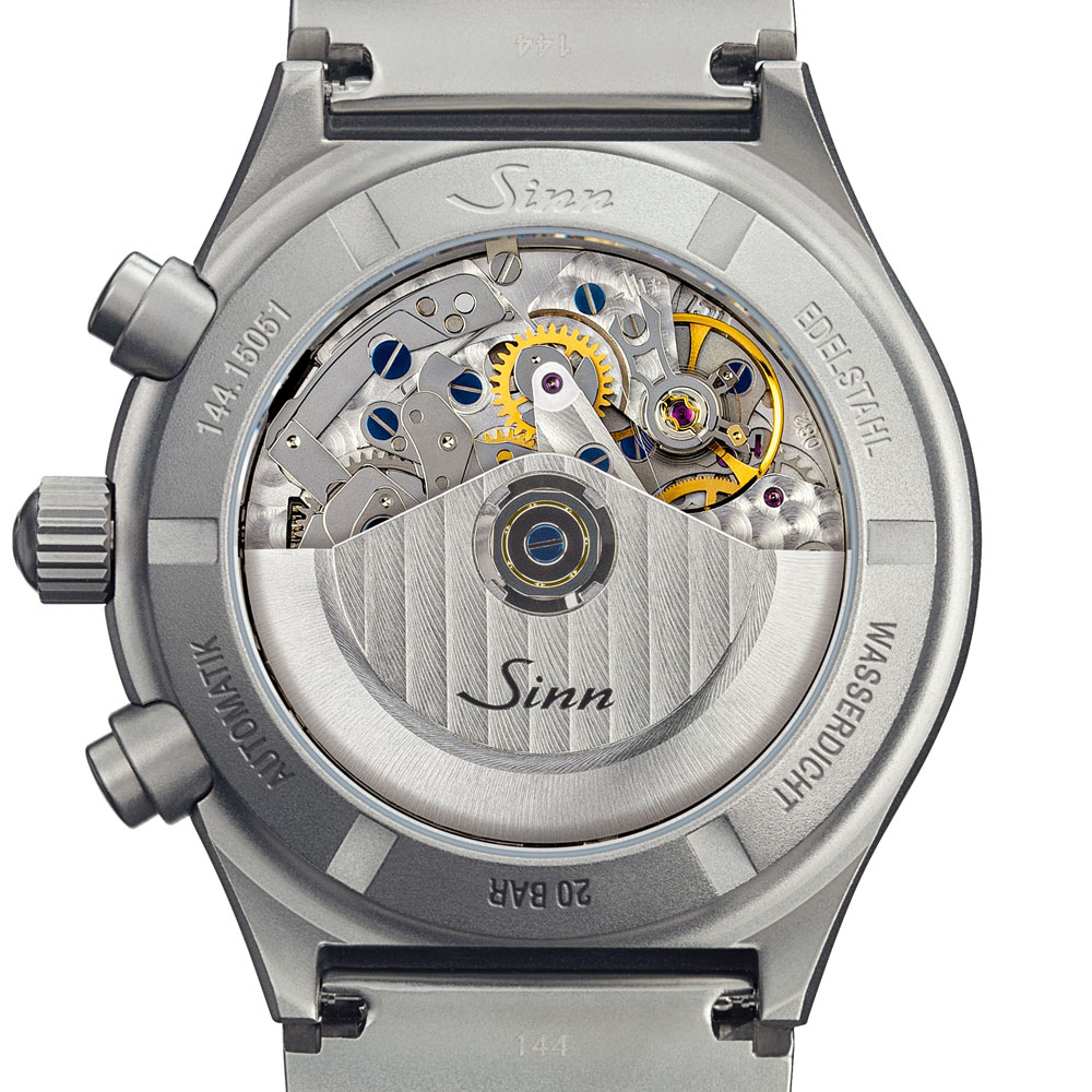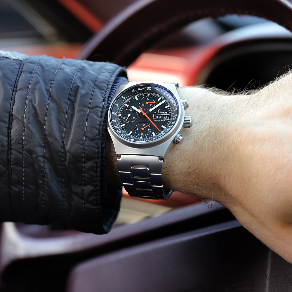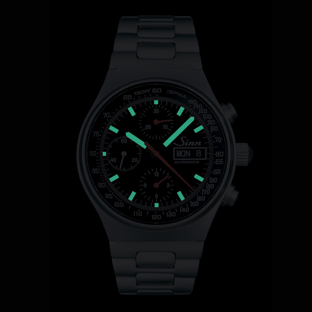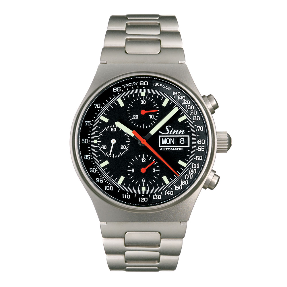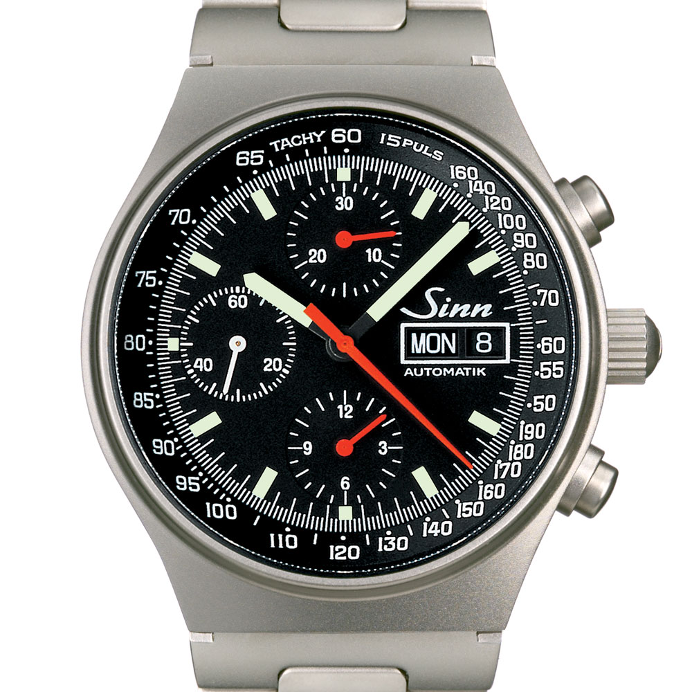 超精密仕上げ、機能性、作業性、操作性そして視認性をテーマに開発されたコンパクトなクロノグラフです。1kmの走行時間で時速を換算できるタキメーター表示に、15パルス(脈拍)のカウント時間で1分間の脈拍を測ることができるパルスメーターを備えています。タキメーターの高速部分のスケールにパルスメーターを組み込んだ設計が、このモデルの特徴的な部分です。