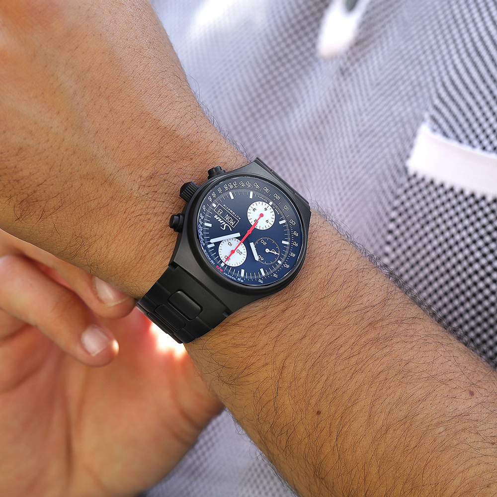 タキメーターと組み合わせたパルスメータースケールには、創立60年の記念として「60」の数字に朱色の蛍光仕上げを施しています。このユニークなナンバリングを施した限定モデル「144.ST.S.JUB.II」は、ケースと同様にブラック・ハード・コーティングを施したソリッドブレスレットに加え、ブラックのシリコンベルト1本が付属されます。