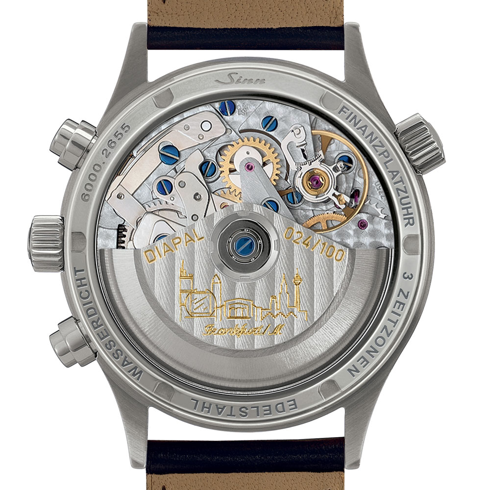 モデル6000.JUB.IIは、フランクフルト経済振興協会の要請を受けて開発されたファイナンシャル・クロノグラフ6000の誕生10周年を記念して2009年に発表されたリミテッドモデルです。世界限定100本のうち、日本入荷はわずか10本という希少性の高い限定版。従来モデル同様の3タイムゾーン表示機構を搭載し、ムーブメントのローターにはフランクフルトの摩天楼の模様が手彫りでエングレービングされています。品のあるブラウンのダイヤルにブレスレットが装着されたモデルには、ダイヤルの色に合わせたブラウンのアリゲーターストラップが付属されます。