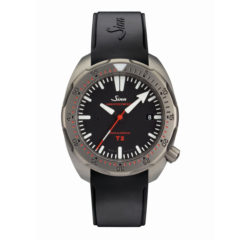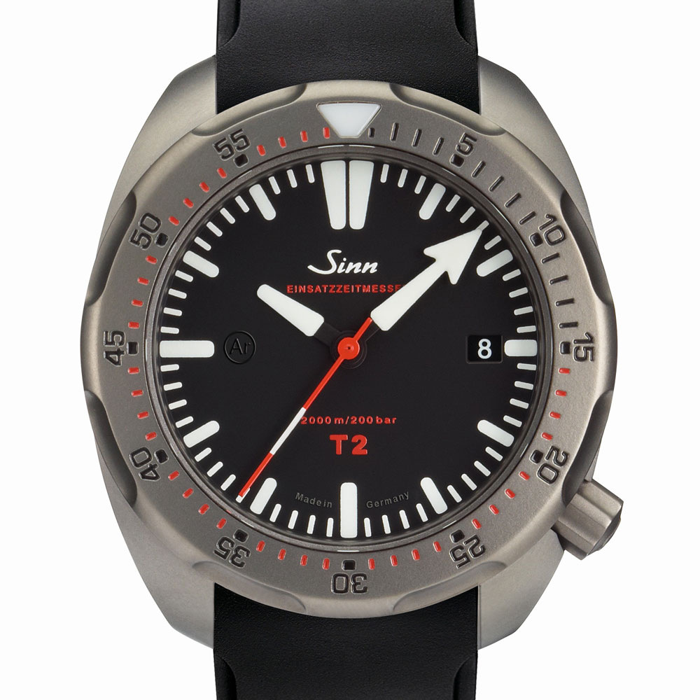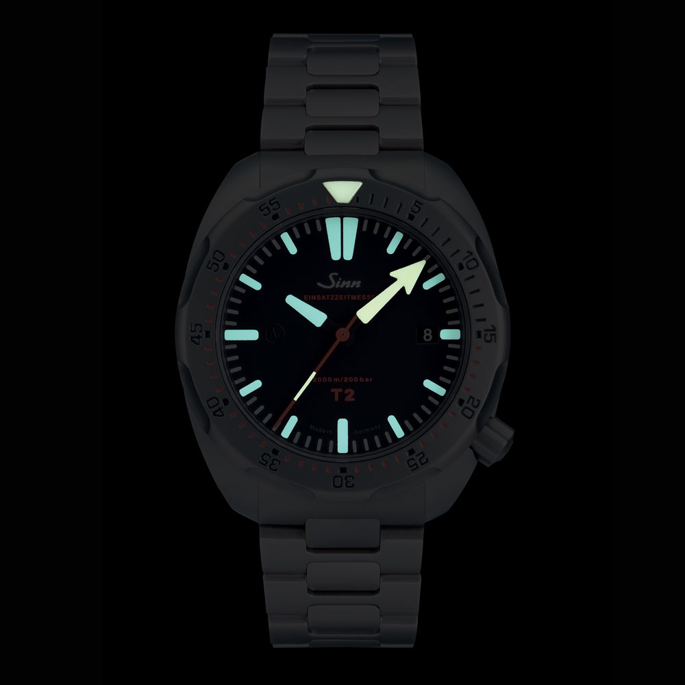 プロのダイバーにとって安全性は最も重要です。ゆえにT2には、回転ベゼルに2つの安全対策が施されています。ひとつはジン独自の特殊結合方式により、ネジで下部のリングに固定された回転ベゼルは不意の衝撃でも外れることがありません。もうひとつは衝撃などにより意図せずベゼルが回転しないための構造です。回転ベゼルは、ベゼルの2点を下に押し下げることで初めて回転させることができます。デザインにおいては、時分針のデザインを異なったものにすることでセットした時間の判読性を高めています。さらに、暗所や不利な状況下でセットした時間の読み取りがしやすいように、T2は分針と回転ベゼル上の三角のポイントの夜光の色を変えています。暗所では分のインデックスと時針がブルーに、分針と回転ベゼル上の三角のポイントが白く発光します。