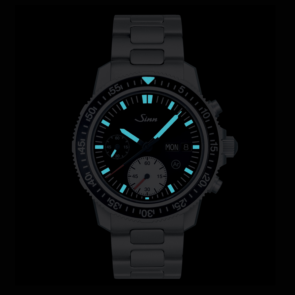 ダイビングに必要な堅牢性、機能性、そして高い精度の信頼性を持つ613 Stは、EZMシリーズとは異なり、リューズとプッシュボタンを右側に配置した実用的なダイビングクロノグラフです。