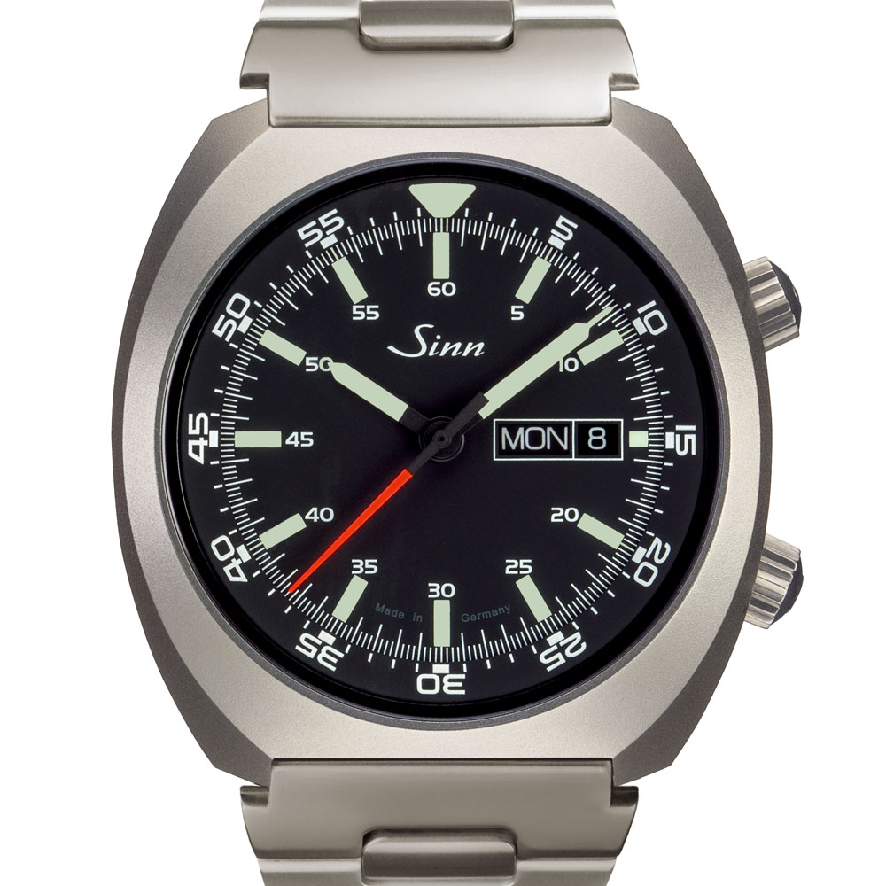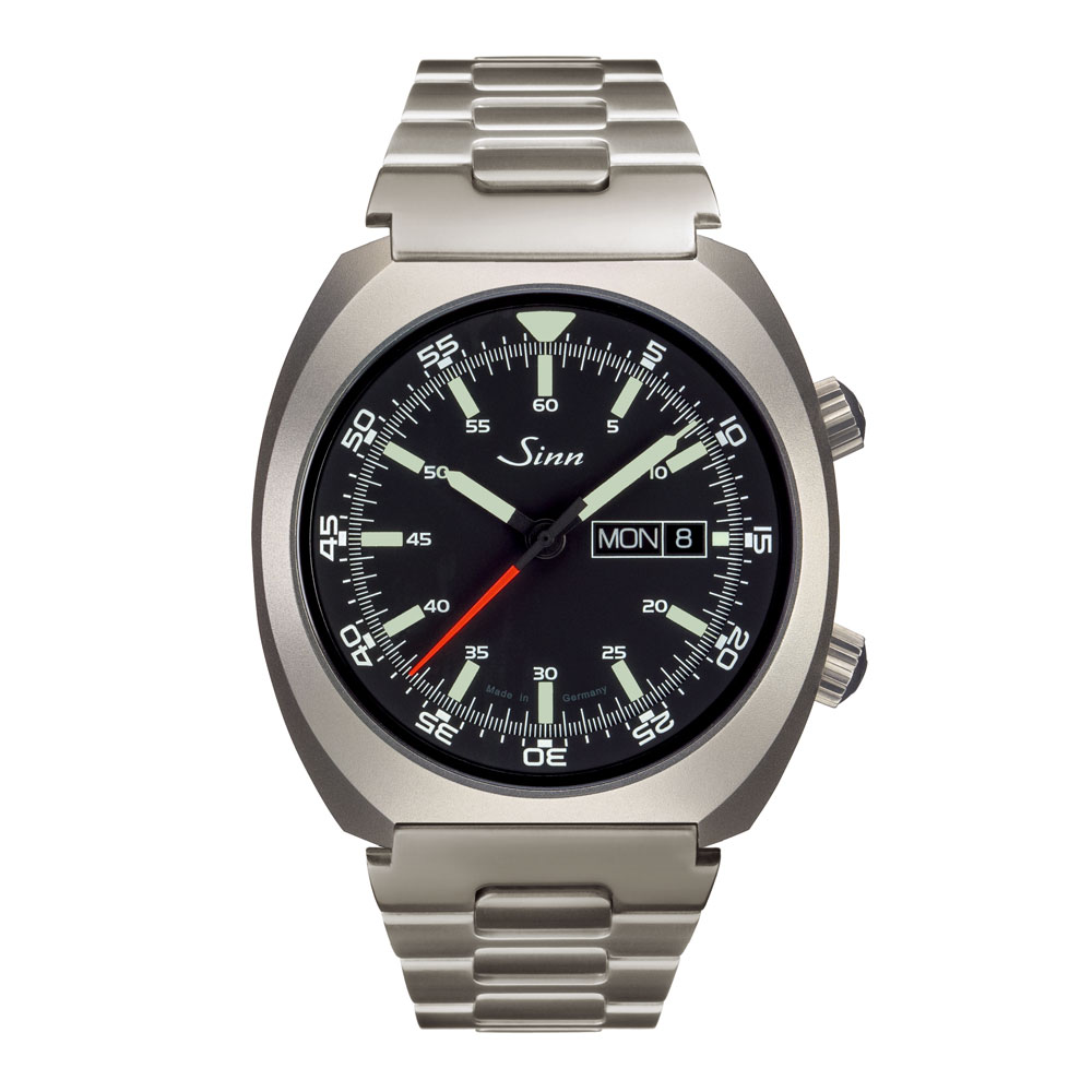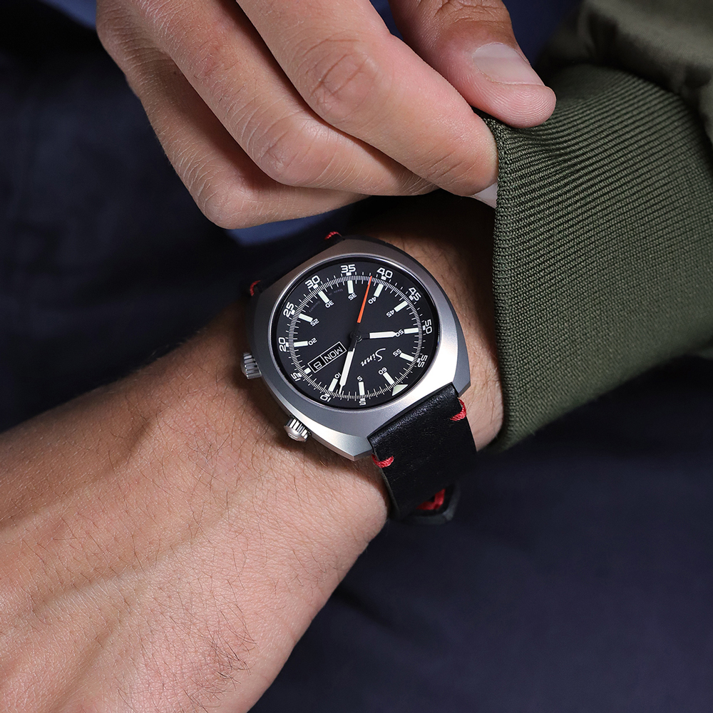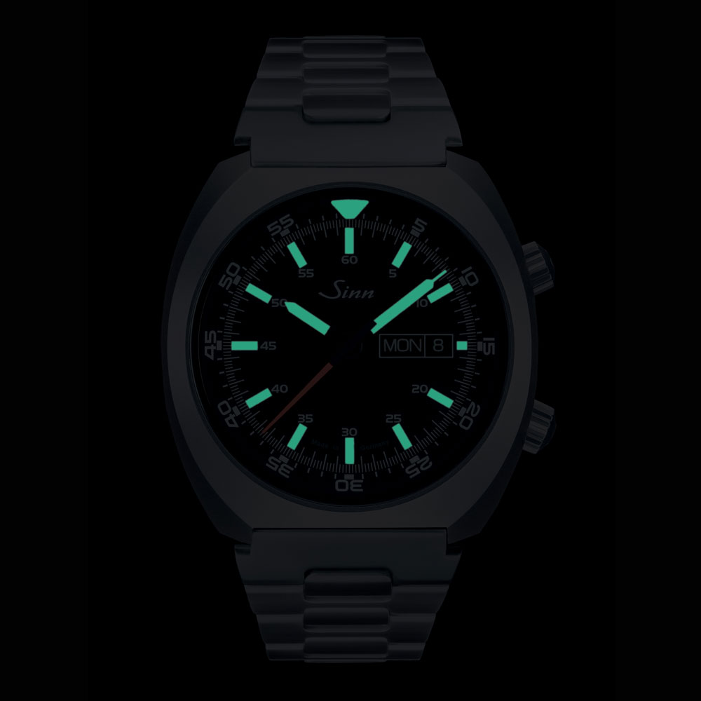 240.STはジンのスペースクロノグラフ140の三針モデルに位置付けられます。その特徴は、主な機能性と高い視認性に尽きます。伝統的なスタイルをもとにしたクラシックなデザインと直径43mmの時計ケースを備えたこのモデルは、ジンの腕時計とはっきりわかる特徴――すなわちシンプルな見やすさを最優先するスタイルを持っています。夜光処理を施した時・分針とインデックスで暗所でさえも完璧な視認性があり、日付表示およびドイツ語と英語表記を選択できる曜日表示も搭載。サンドマット仕上げの鈍い光沢を持った堅牢なフォルムでありながら、回転ベゼルをインナー式にすることでスマートなスタイルを実現した、高い視認性と正確な刻時機能を誇るスポーツウォッチです。
