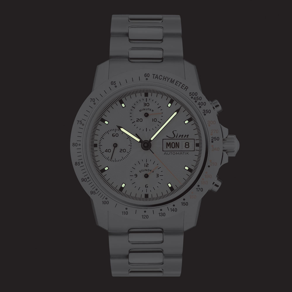 モーターリストのためにデザインされた303.SILBER.TYはタキメーター表示に特徴のあるクロノグラフです。60km/hから500km/hまでのスピードが表示されたベゼルのタキメーターには、タイヤの制限速度規格に対応したスピード数値が赤く塗られています。これにより通常のタキメーターの使用時に、自身の車両の制限速度を超えず、安全運転を行える配慮がなされています。曲面加工のサファイアクリスタルの風防により広い角度から文字盤を見ることが可能になり、陽射しを正面から受けることの多いドライバーを考慮しました。