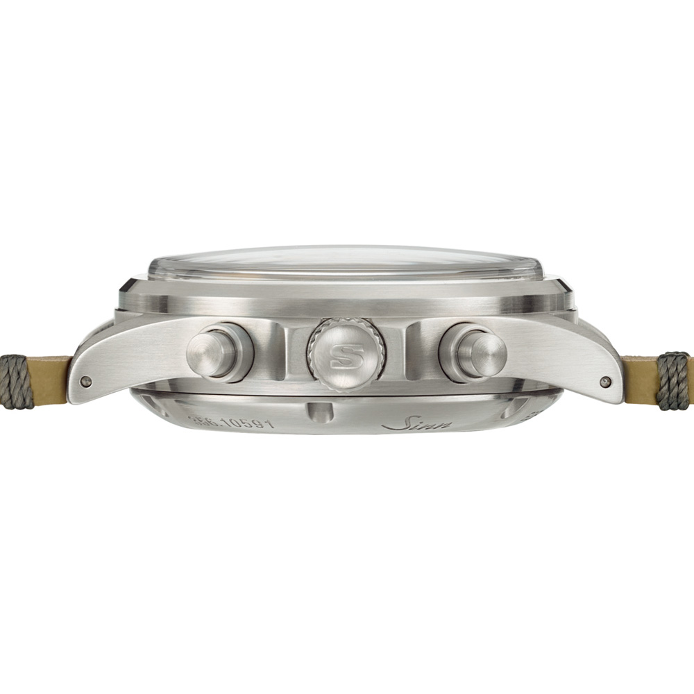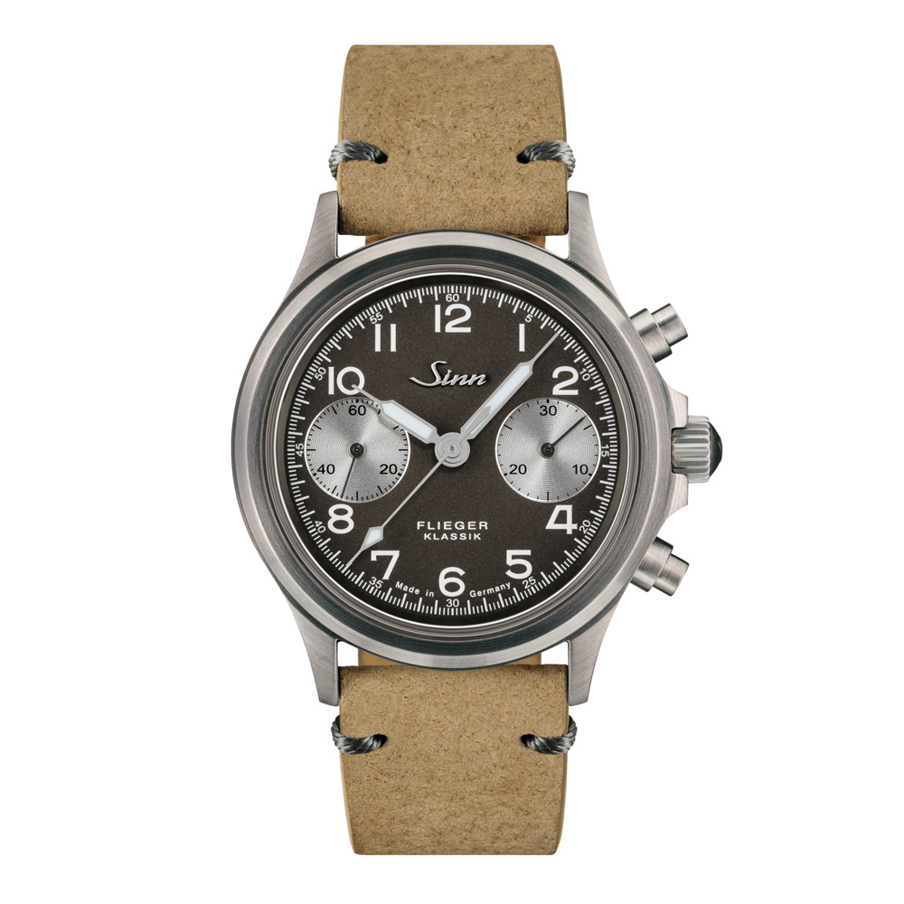 文字盤にはドイツ語で「FLIEGER KLASSIK」の文字を配置、初代のアクリル風防と同じ形状を持つハイドームのサファイアクリスタルです。アンスラサイト文字盤に2カウンターをバイコンパックスで配置した、特別なモデルです。