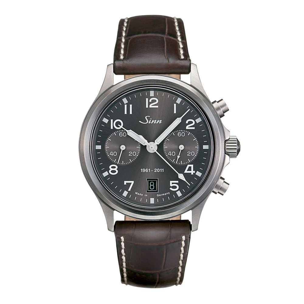 ブランド創立50周年限定モデルの358.JUBは、500本の限定モデル。”1961-2011” と記されたチャコールグレーのダイヤルに、Valjoux7750をベースにSinn社独自で開発したムーブメントを搭載。クロノグラフのインダイヤルには通常30分積算計が搭載されていますが、このキャリバーSZ05では3時位置に60分まで計測できるカウンターが配置され、9時位置に秒針(スモールセコンド)が搭載されています。“使うためだけの時計”を追求し続けるジンならではの操作性を考慮したクロノグラフの配置です。