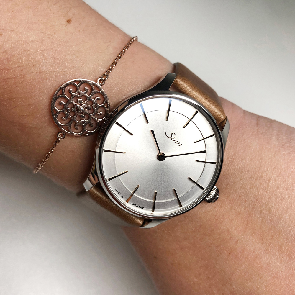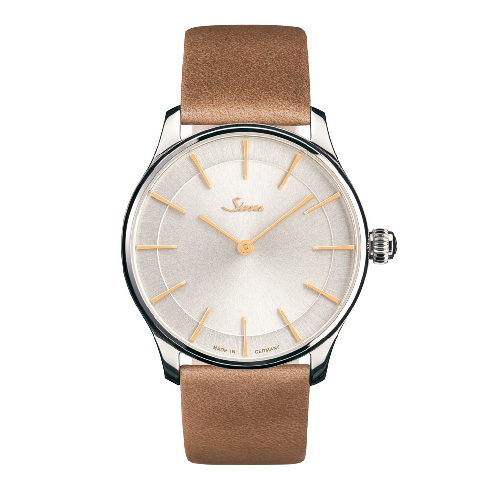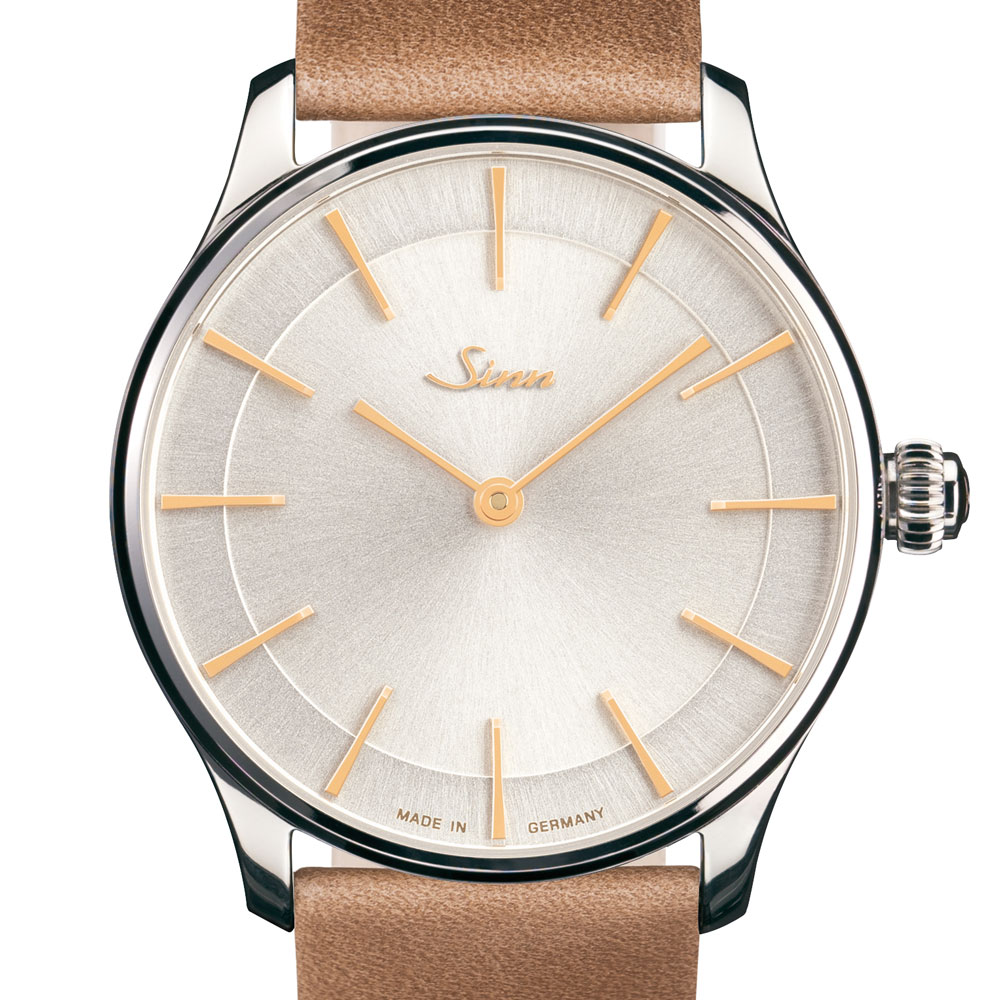 このモデルは時・分針のみのシンプルなスタイルで、ジンのコレクションの中でもクラシックシリーズに位置づけられモデルです。スマートに整えられたゴールド仕上げの針や、手作業により入念に取り付けられたアプライドインデックス、サンレイの装飾を施したシルバー仕上げのダイヤルといったディテールの効果的な相互作用により、非常に絶妙でエレガントな雰囲気を作り出しています。ケース直径36mmという程よいサイズ感とタイムレスでクラシックなデザインのこのモデルは、従来のスタイルを巧みに取り入れ、伝統的要素をスパイスに、サファイアクリスタルで高級感を高めています。