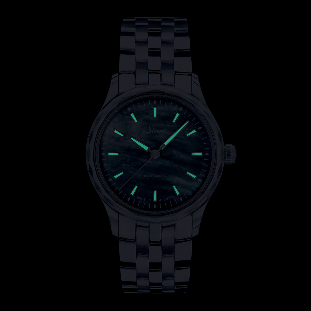 このモデルは、ベゼルに24個のファセットカットを装飾し、文字盤の美しいマザーオブパールを引き立てています。