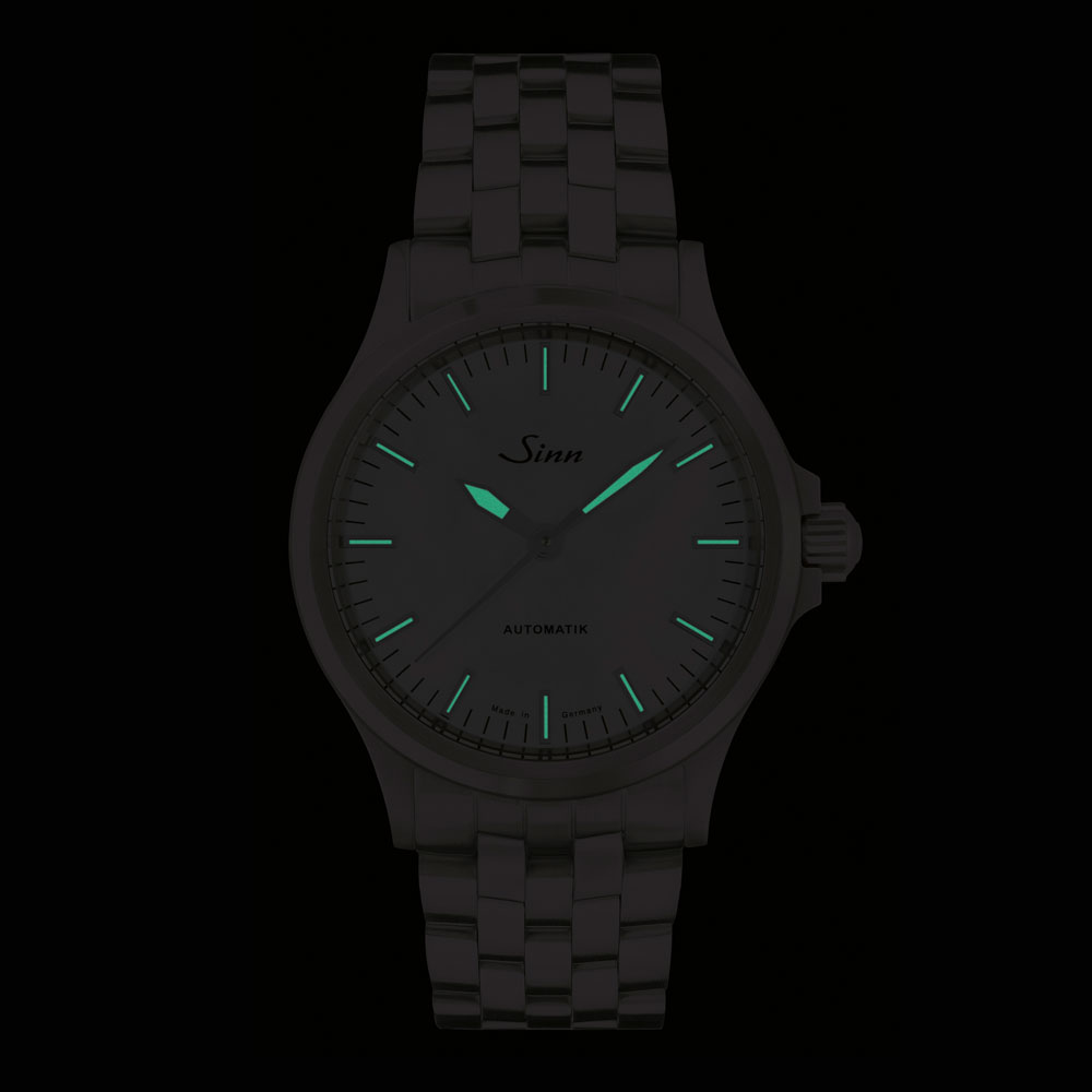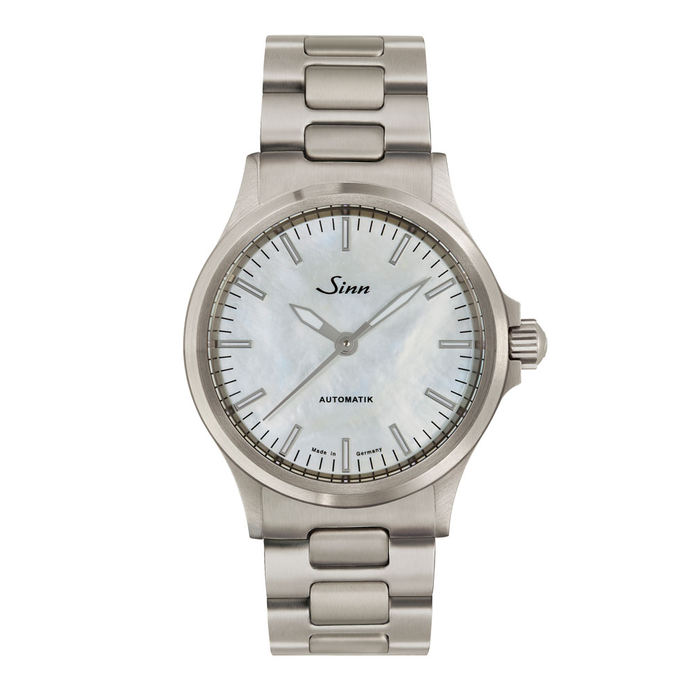 シンプルで時代を超えたデザインの556シリーズに登場したマザー・オブ・パールダイヤルのモデルです。サテン仕上げのステンレススチールケースと5連のブレスレットでエレガントなスタイルを強調しながらも、20気圧の防水性(DIN8310)や耐磁性(DIN8309)はドイツ工業規格に基づき製作されています。日付を排したシンプルなダイヤルは視認性も高く、アプライドインデックスと時分針にはスーパールミノバを施してあるので暗所での視認性も確保。ユニセックスな時計として幅広くご使用いただけます。