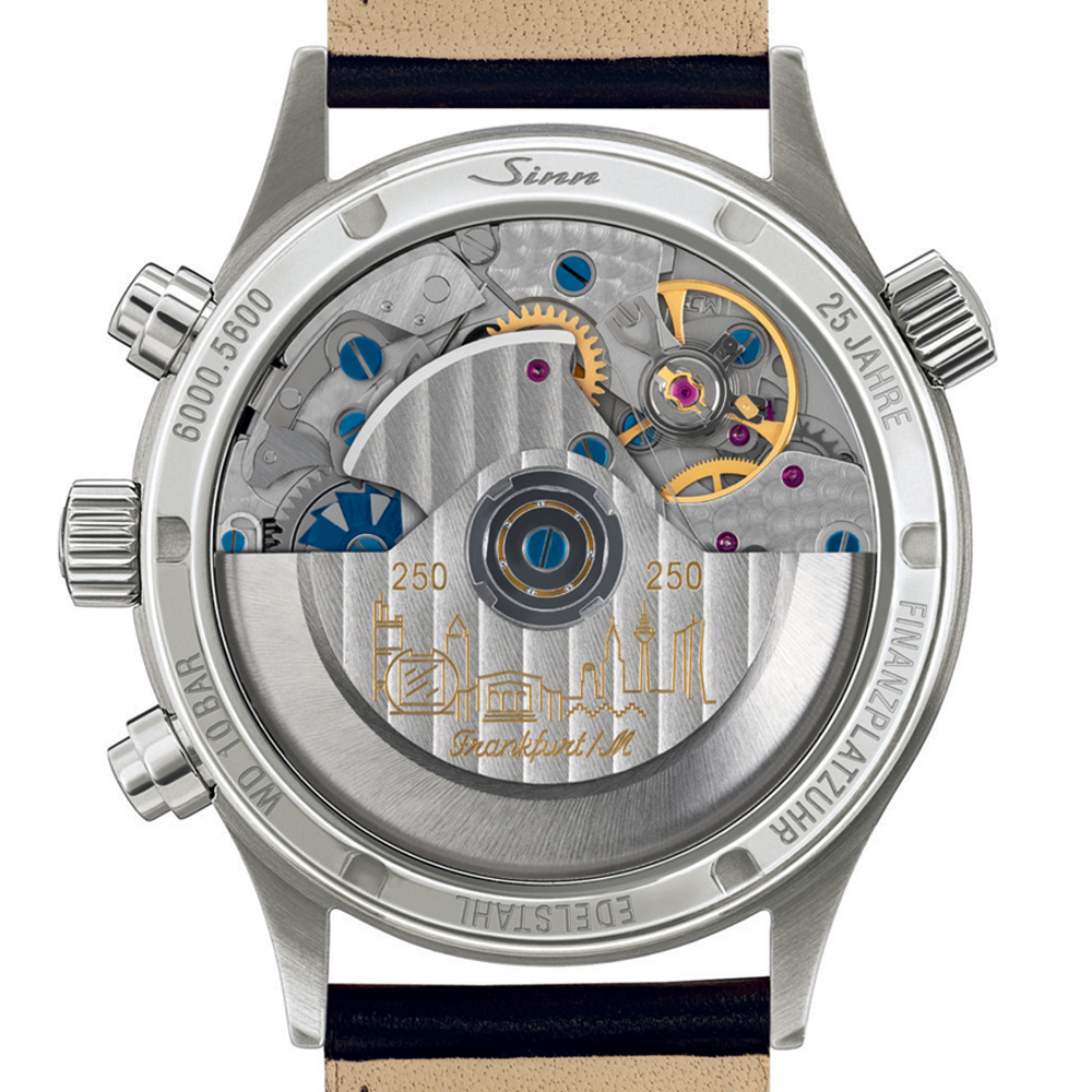 フランクフルト経済振興協会の要請を受けて開発されたフランクフルト・ファイナンシャルシリーズの誕生から25年を記念して、250本の限定で製作された3つの時間帯表示を備えたクロノグラフです。シルバープレートのダイヤルや、時分針およびアプライド・インデックスに施した光沢のあるブルーはこのシリーズでは初めての試みで、全体的な外観を印象的で新鮮なものにしています。直径38.5mmのケースに収められたムーブメントは複雑機構であるコラムホイール・クロノグラフの芸術的メカニズムを備え、ローターにはフランクフルトの摩天楼や限定番号を刻印しています。