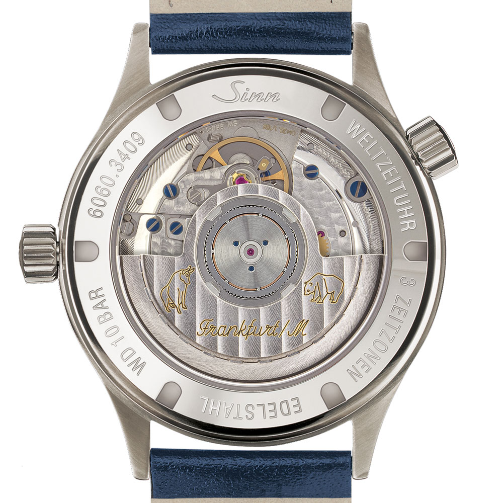 Sinn(ジン)がフランクフルト経済振興会からの依頼で製作したフランクフルト・ファイナンシャルシリーズに新たに誕生した、3タイムゾーン表示機構を搭載したファイナンシャル・ウォッチです。サンレイ仕上げの美しいブルーダイヤルが特徴で、ローターには証券市場で使われる強気市場を表す雄牛(ブル)と弱気市場を表す熊(ベア)とが刻印されています。