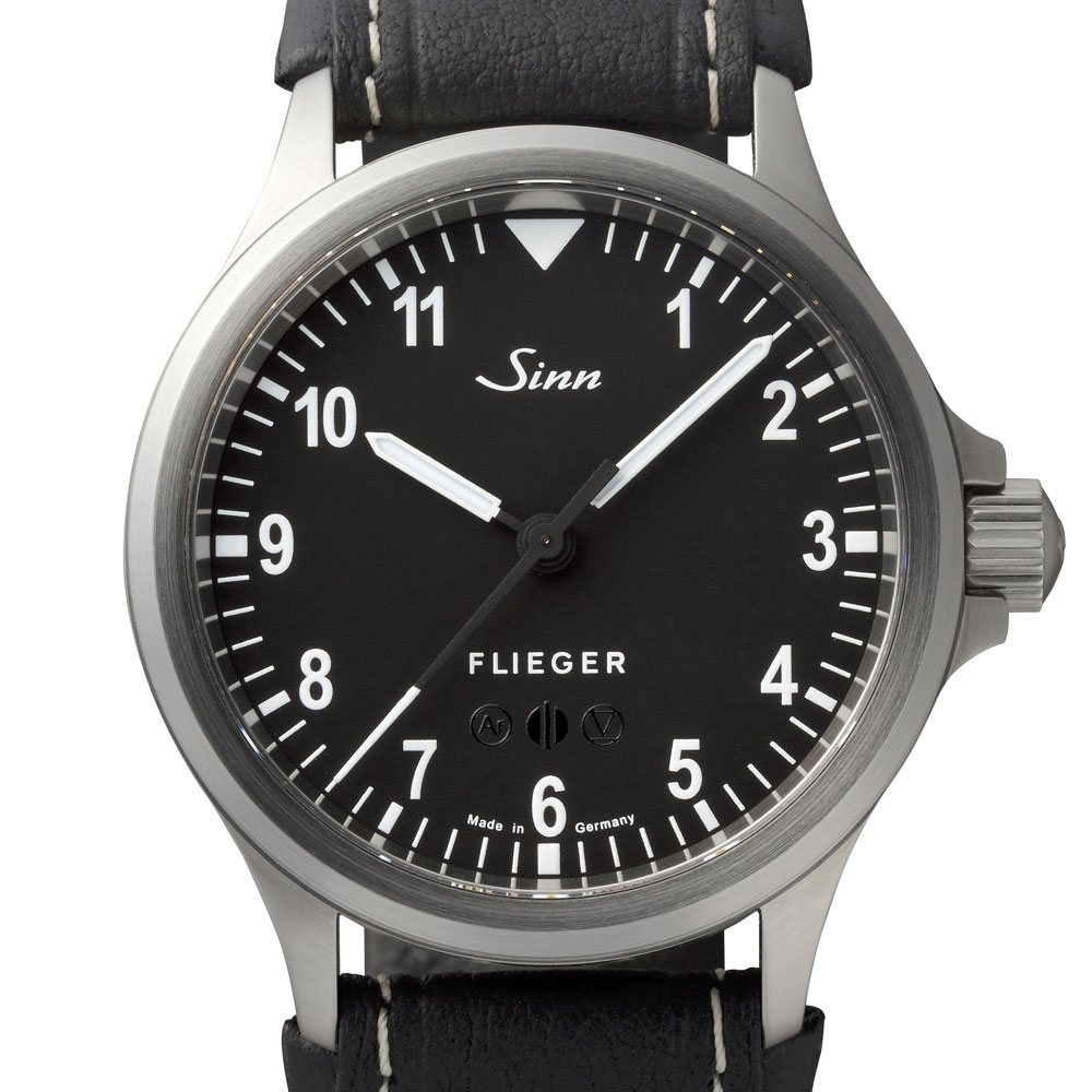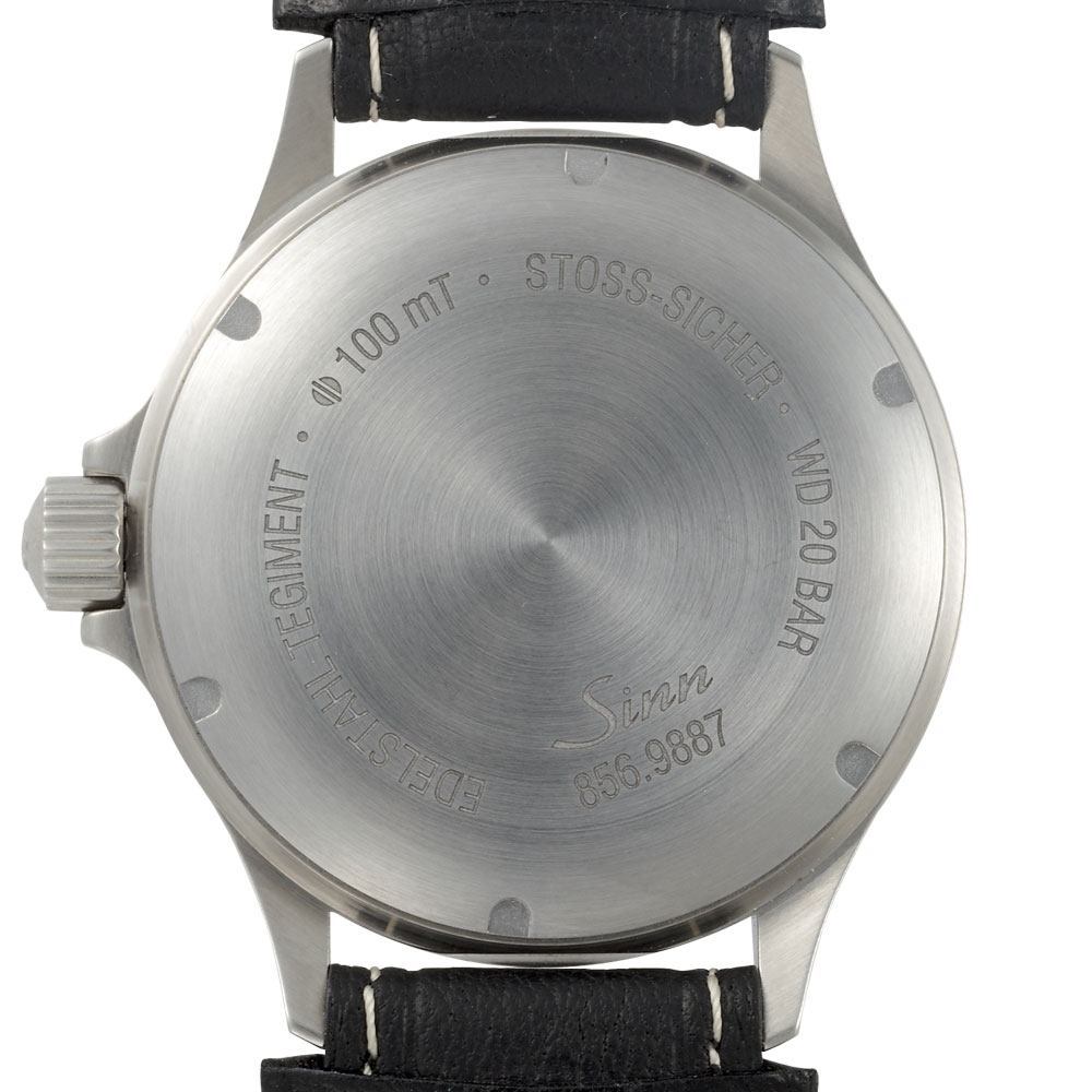 高い防磁性能を備えた「マグネチック・フィールド・プロテクション」や、時計内部を除湿する「Arドライテクノロジー」、高い硬度を実現した「テギメント加工」というジン・テクノロジーを搭載した856シリーズのダイヤルは、コックピットクロックのデザインを映した3・6・9・12の大きなアラビア数字のインデックスが特徴です。この4ヵ所のみだったアラビア数字を、12時位置のマーカーを除いたすべてをアラビア数字にし、その名の通りドイツのクラシックなパイロットウォッチのスタイルを採ったのが、この856.FLIEGERです。テギメント加工により硬化させたステンレススチール製のケースはヘアライン仕上げを採用しています。ダイヤルの6時位置には、このモデルが搭載する3つのテクノロジーのマークが印され、日本限定50本で販売されます。