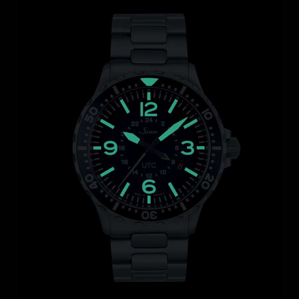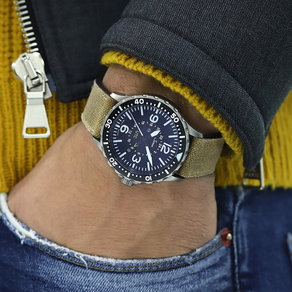 モデル857は、機能的形態と長年にわたるナビゲーション時計の技術を活かして開発したコックピットクロックの性能とのふたつを融合したモデルです。3・6・9・12のインデックスを強調したダイヤルデザインと航空用回転ベゼルにより刻時の視認性が高く、24時間式の第二時間帯表示はプロのみならず世界中どこにいても本国の時間を知るのに便利な機能です。シリーズの他のモデル同様にマグネチック・フィールド・プロテクションによる80,000A/mという高い防磁性能、テギメント加工によるセラミックと同様の高硬度も備えています。テギメント加工はケースのみならず回転ベゼルにも施され、特殊結合方式により衝撃で外れることがない屈強なモデルです。