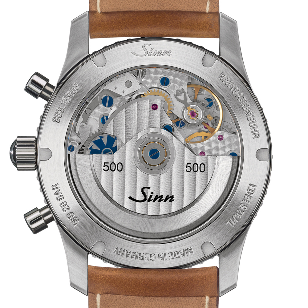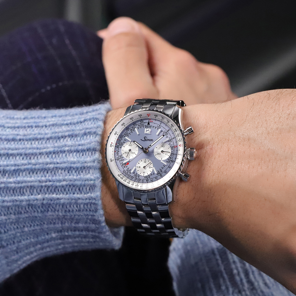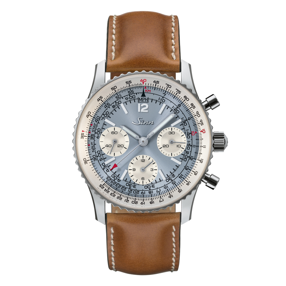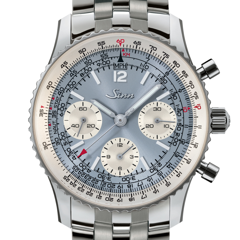 ライトブルーのサンレイ文字盤が美しいこのナビゲーション・クロノグラフは、ジンが完全に再設計した新しい903シリーズの、世界500本の限定モデルです。