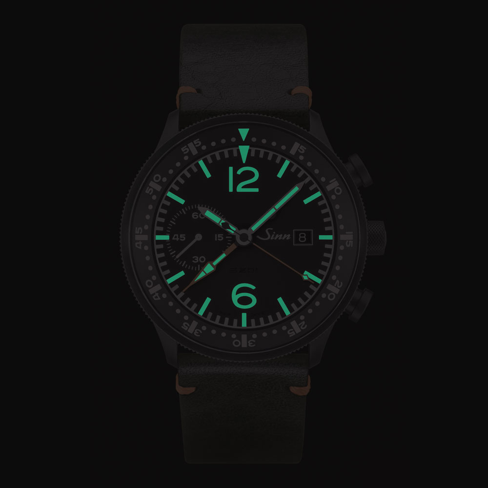 モデル717にもこのスタイルが踏襲されており、ジンのクロノグラフムーブメントSZ01により、センター配置のオレンジ色の大きな針でクロノグラフの秒と分を表示しています。耐傷性の高いブラック・ハード・コーティング仕上げのケースには、外側からスムーズに操作できるインナー・パイロットベゼルを搭載。コックピットクロック同様に両面無反射コーティングを施したサファイアクリスタルがこのベゼルと一体化してまわる構造は、このモデルの特徴のひとつです。文字盤はコックピットクロックと同様に暗闇や悪条件下でも優れた視認性を発揮します。Arドライテクノロジーによりサファイアクリスタルの曇りも防止されます。まさにジンのコックピットクロックそのものの外観を持っています。