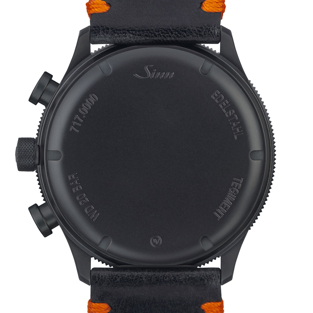 モデル717は、1970年代後半にドイツ空軍のトルネード計画のためにジンが設計したコックピットクロック「Nabo 17 ZM」からインスピレーションを受けて製作された、コックピットリストウォッチです。現在も軍の多機能戦闘機トルネードに採用されているNabo 17 ZMの特徴は、クロノグラフのストップウォッチ表示がセンターに配置されており、秒と分を示すオレンジ色の針が見やすいことでした。