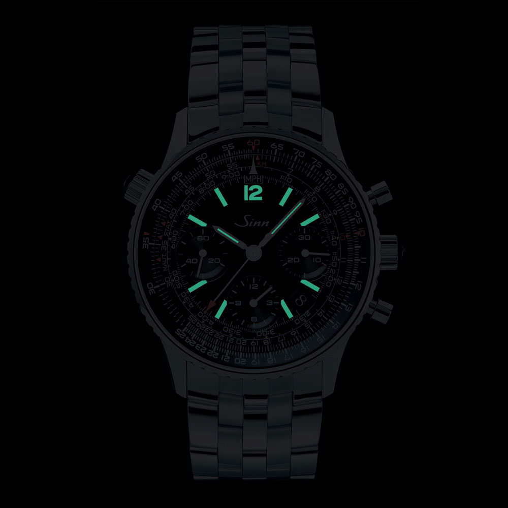 モデル903はパイロット、ナビゲーター、コミューターのための機能が盛り込まれた計時機器です。インナーベゼルに刻まれているスケールで速度、距離、燃料消費、上昇および下降速度をはじめマイルやキロへの換算ができ、このベゼルは10時位置のリューズで操作が可能です。3時位置の30分積算計、6時位置の12時間積算計、9時位置のスモールセコンドを備えた典型的なクロノグラフのダイヤル配置です。サファイアガラスによるシースルーバックで、ムーブメントの動きを楽しむことができます。