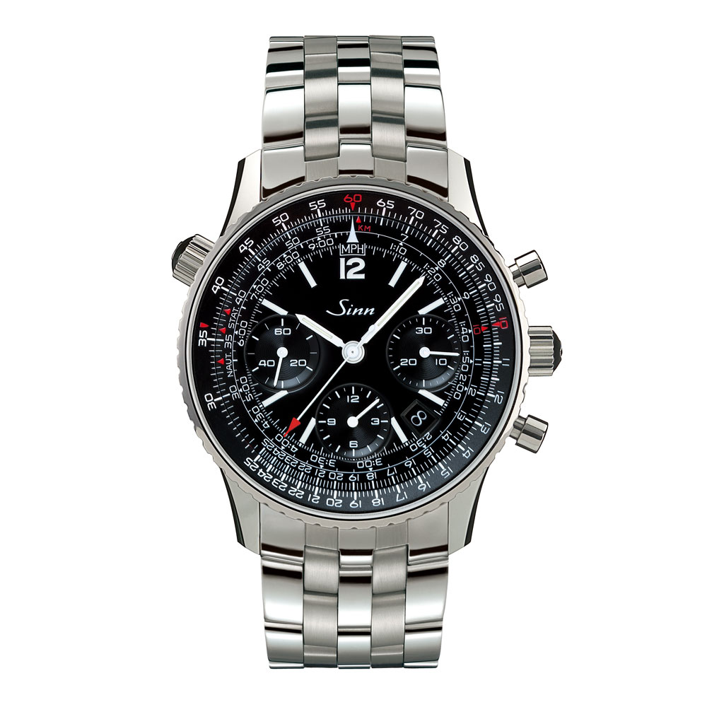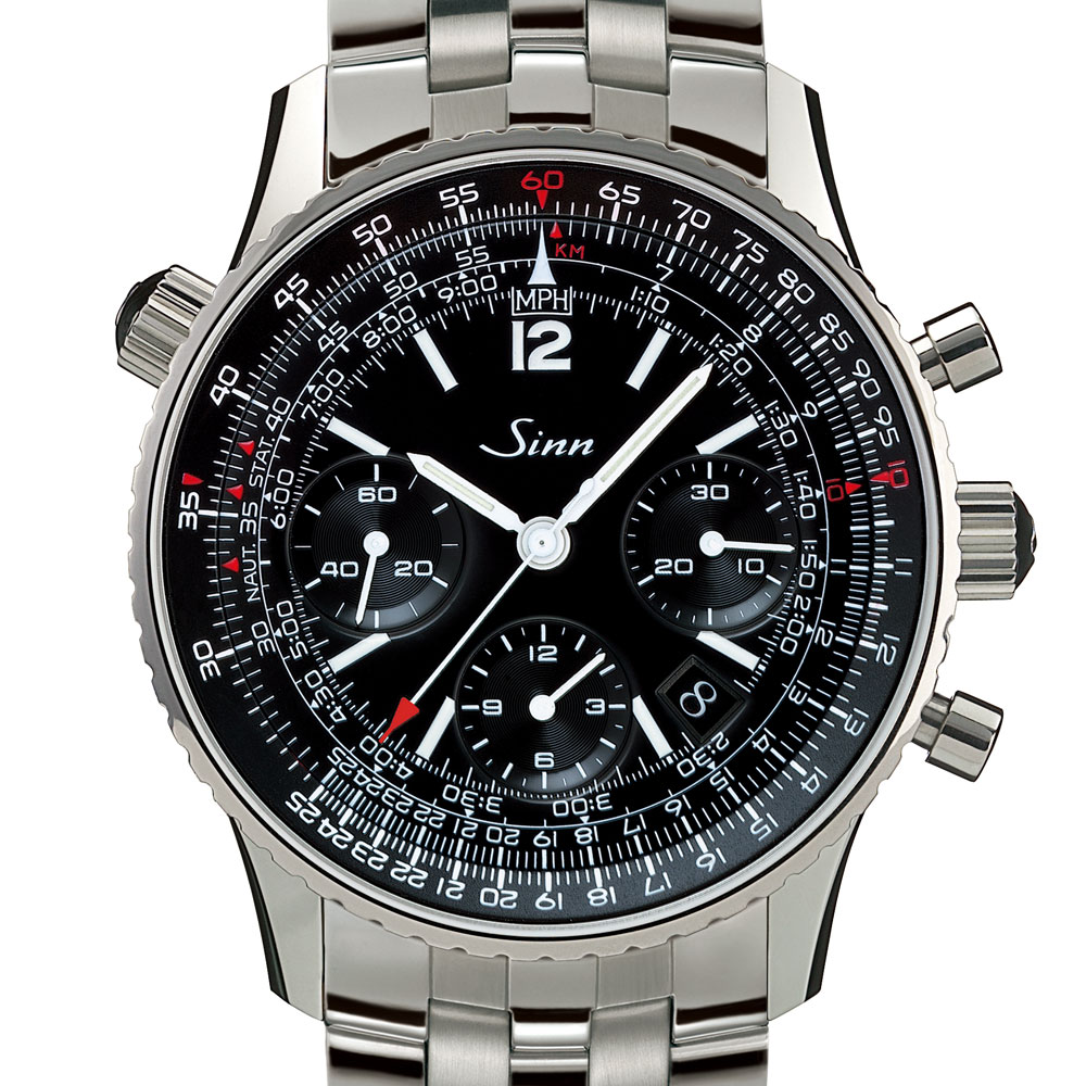 モデル903はパイロット、ナビゲーター、コミューターのための機能が盛り込まれた計時機器です。インナーベゼルに刻まれているスケールで速度、距離、燃料消費、上昇および下降速度をはじめマイルやキロへの換算ができ、このベゼルは10時位置のリューズで操作が可能です。3時位置の30分積算計、6時位置の12時間積算計、9時位置のスモールセコンドを備えた典型的なクロノグラフのダイヤル配置です。サファイアガラスによるシースルーバックで、ムーブメントの動きを楽しむことができます。