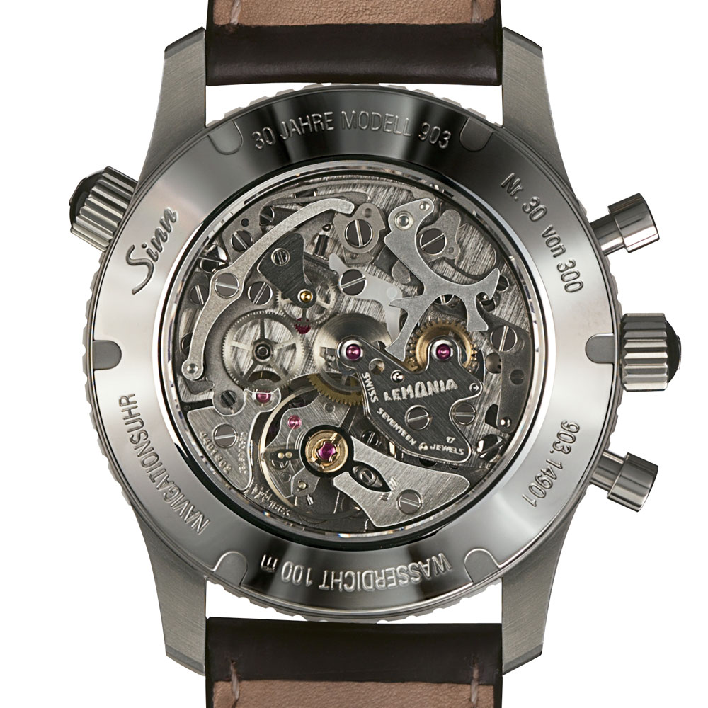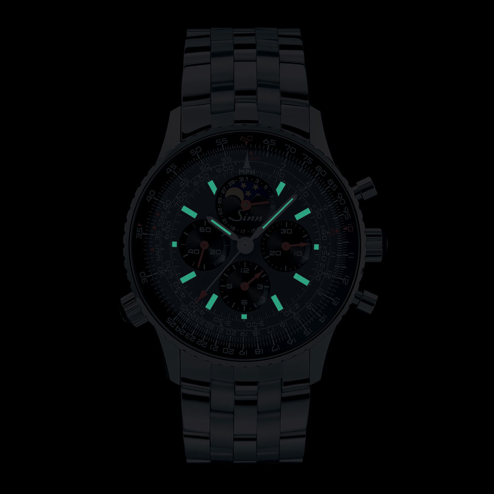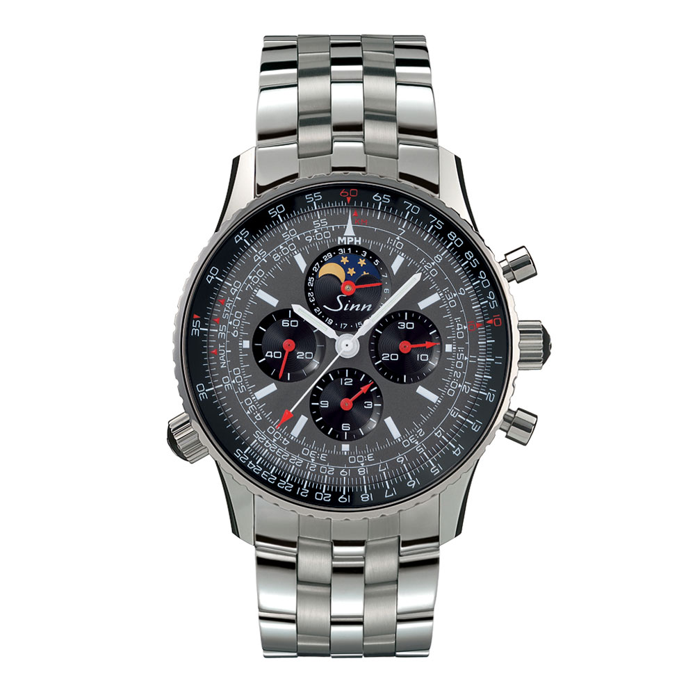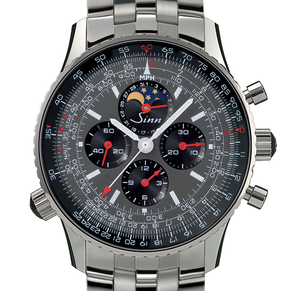 903.H4は、パイロット、ナビゲーター、コミューター用の計時機器で、ダイヤル外周の回転ベゼルにあるスケールで、速度、距離、燃料消費、上昇および下降速度をはじめマイルやキロへの換算などが可能な回転計算尺付きクロノグラフです。ムーンフェイズ機能を搭載しているので、月の満ち欠けもわかります。デザインは計算尺の基準となるポイントやインダイヤルの針の赤い配色がグレーのダイヤルに映える洗練された印象。生産終了のムーブメントを使用しているため希少性も高く、機械式時計のファンやコレクター垂涎のモデルです。