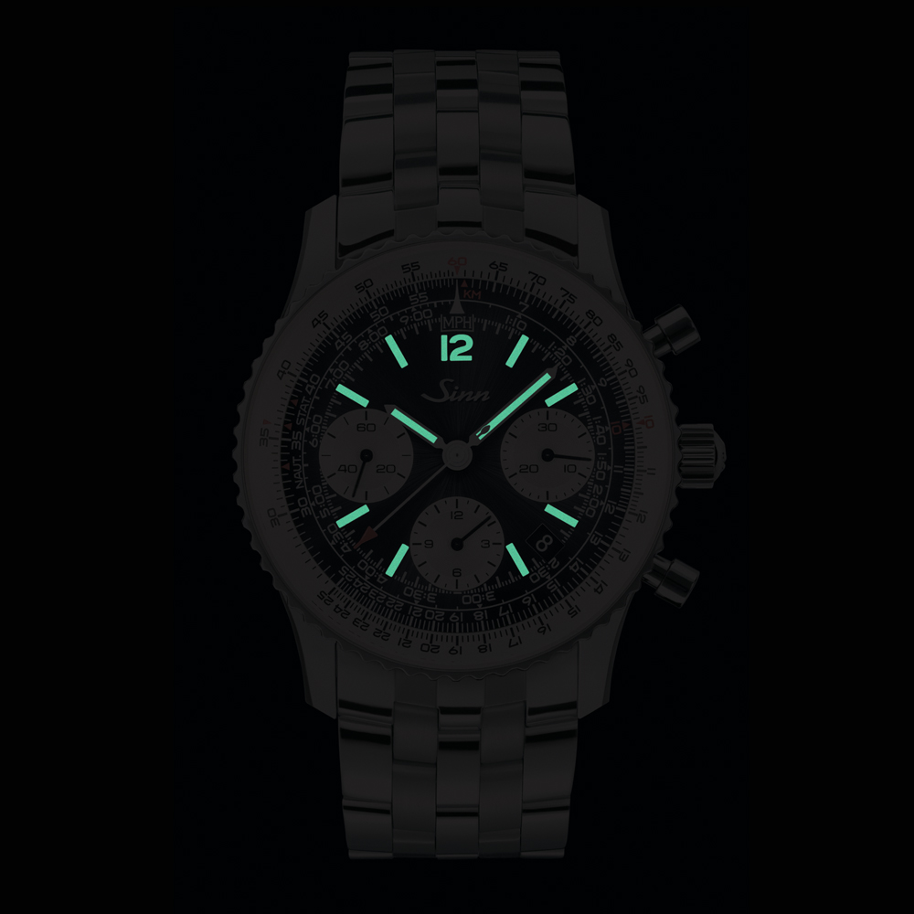 ジンのコレクションにおいてナビゲーション・クロノグラフの数十年にわたる伝統を刻み込んでおり、対数目盛りを備えた計算尺ベゼルは、時間、距離、燃料消費量の計算に使用できます。特筆すべきは、手作業で丁寧に取り付けられたインデックスや、12の数字、時分針にハイブリッド・セラミックの夜光塗料を使用していることです。高濃度の夜光塗料をそれぞれのハイブリッド・セラミックに使用するという革新的な方法により、極めて高い輝度と暗闇での完璧な視認性を実現しています。