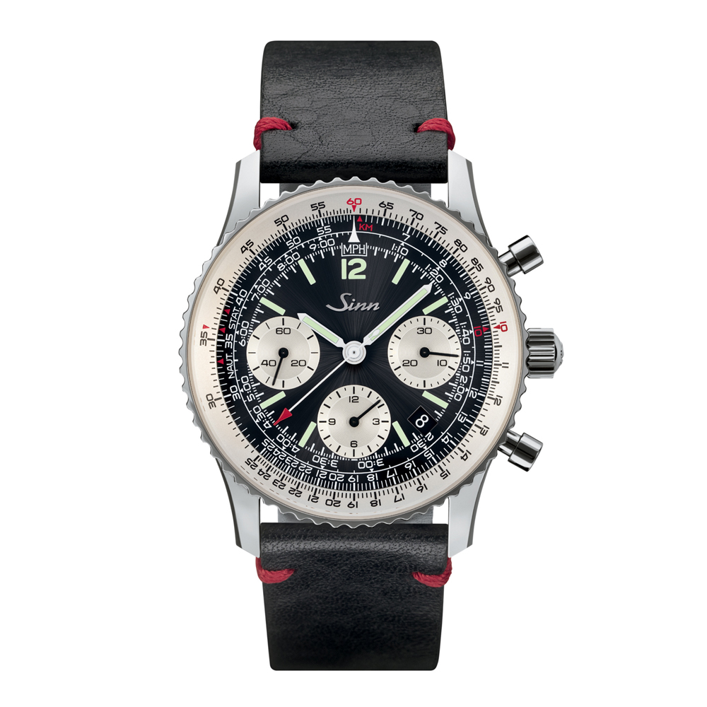 Sinn(ジン)を代表する903シリーズを完全に再設計し誕生した、ナビゲーション・クロノグラフです。コラムホイールを備えたムーブメントや時計の外径から操作する回転計算尺付きベゼル、高濃度の夜光塗料を使用したハイブリッド・セラミックのアプライドインデックスを備えています。