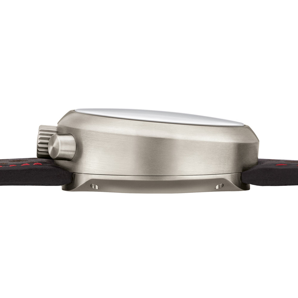 300本限定のR500は、ジンのコレクションに久しぶりに加わったレーシングストップウォッチです。このモデルを際立たせているのは、12時位置のリューズと11時位置と1時位置のプッシュボタンのポジションです。その配置が牛の頭のように見えることから「ブルヘッド クロノグラフ」とも呼ばれています。インナーベゼルには速度を計測するためのタキメータースケールを備え、ダイヤルの12時位置には実用性の高いパワーリザーブ表示を搭載しています。ブルヘッドスタイルのこのモデルのケースは極端な構造となっており、上部と下部で厚さの異なるケースとともにダイヤルは上から下へ傾斜して着用者に向かって角度がついているため、腕に着けたままでもリューズとプッシュボタンを簡単に調整することができます。サテン仕上げのケースには高強度チタン(グレード5)を採用し、快適な装着感を保証します。裏蓋には限定数のシリアル番号が刻印されています。