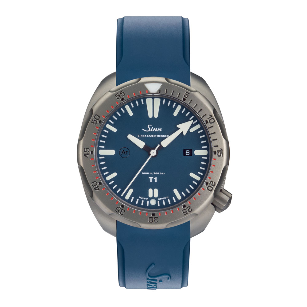 T1.Bはジンのミッションタイマーで、サンドマット仕上げのチタン製ケースにマットブルーのダイヤルが印象的なダイバーズウォッチです。このモデルは従来のT1同様にベゼル構造における2つの要素が特徴です。不意の衝撃でも外れることのないジン独自の特殊結合方式により固定された回転ベゼルと、衝撃などにより意図せずベゼルが回転しないための構造です。回転ベゼルは、ベゼルの2点を下に押し下げることで初めて回転させることができます。形状の異なる時分針のデザインは、セットした時間の判読性を高めるうえに、暗所でも読み取りがしやすいように、分針と回転ベゼル上の三角のポイントの夜光の色を変えています。DNV GLにより欧州潜水器具規格に準拠した、1,000mまでの防水性と、温度耐性および機能性が検証されています。