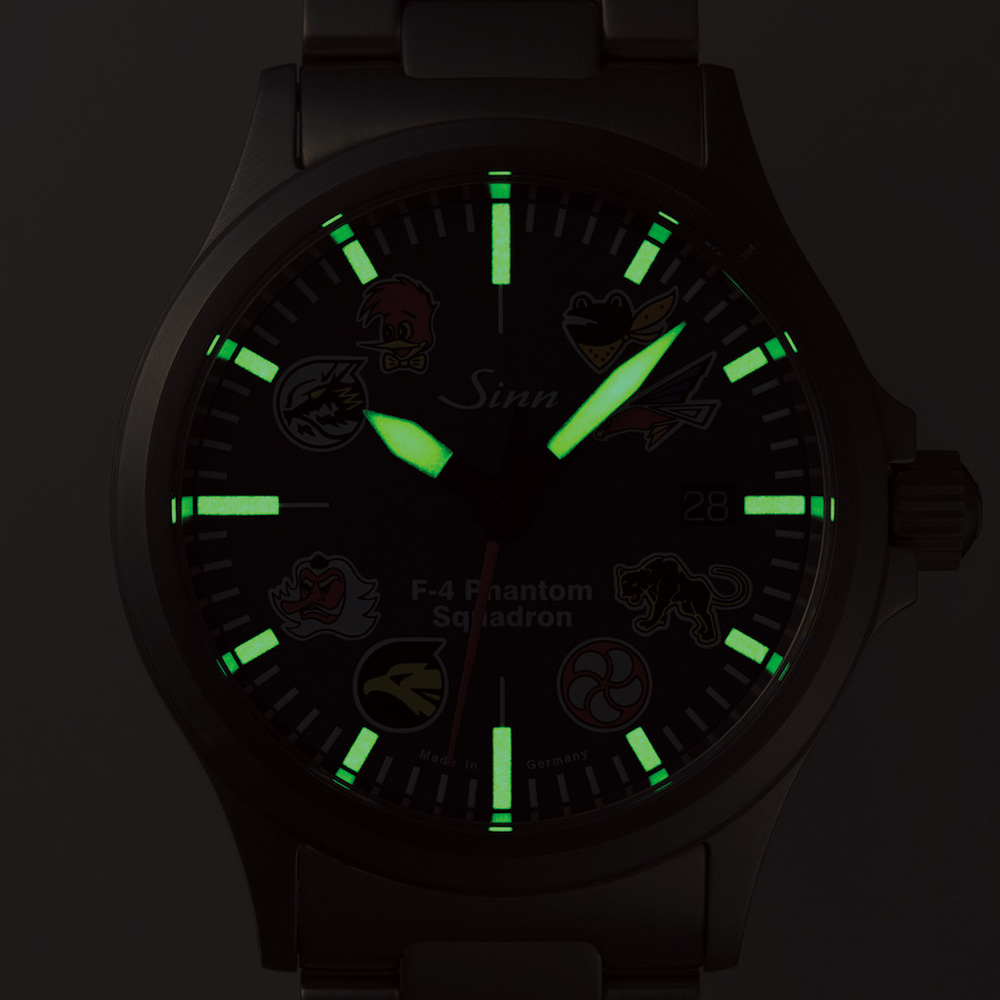 今回の新たな556.F-4.Ⅱは、大空をイメージしたネイビーカラーとバーインデックスを採用することで、8つの飛行隊の部隊マークが引き立ちます。また新たに日付を搭載、サファイアクリスタル製ガラスに20気圧の防水機能を備え、シースルーバックの裏蓋から見えるローターには、ファントム公認キャラクター「スプーク(Spook)」を印しています。この時計は、ジンのプロフェッショナルの高い要求に応えるパイロットウォッチの優れた機能性に加え、随所にファントムのエレメントをデザインした200本限定の特別モデルです。