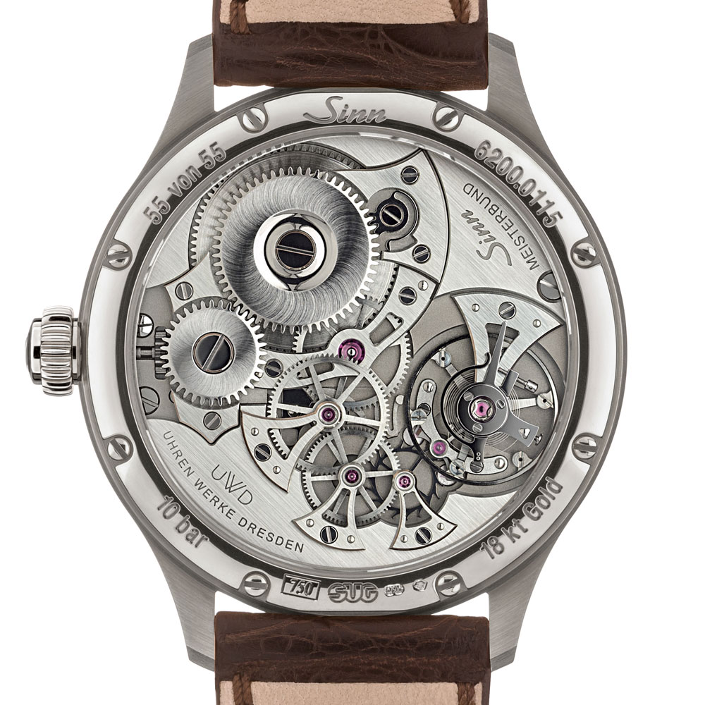 このシリーズの最初のモデル6200.Meisterbund.Iのケース素材に18Kホワイトゴールドを採用したモデルで、ドイツメーカー3社がドイツメイドにこだわって製作した腕時計です。ローズゴールドモデルと同様に18Kホワイトゴールド製ケースの設計と製作はSUG(ザクセン時計技術社グラスヒュッテ)が、伝統的なスタイルのムーブメントはUWD(ドレスデン時計工房)が、そして時計の“顔”と機能性に合わせてフォルムを形作ったのがジン社です。この3社はそれぞれの専門分野でのマイスターであり、素材、精密さ、品質に関する最高の要件を満たしています。この時計の組み立てと製作はドイツで行われ、すべての主要部品はドイツ国内で製造されているので、この時計はドイツの技術者と職人の革新力の堂々たる証でもあるのです。