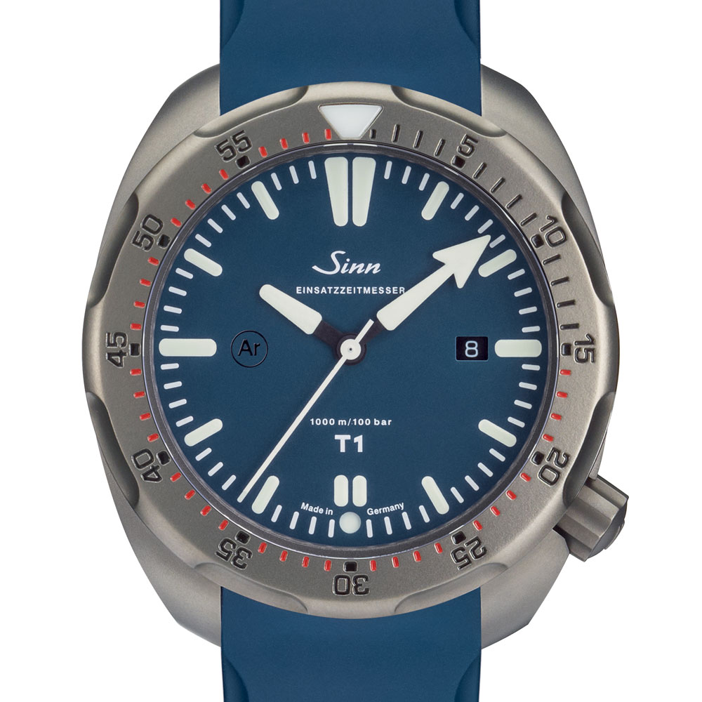 T1.Bはジンのミッションタイマーで、サンドマット仕上げのチタン製ケースにマットブルーのダイヤルが印象的なダイバーズウォッチです。このモデルは従来のT1同様にベゼル構造における2つの要素が特徴です。不意の衝撃でも外れることのないジン独自の特殊結合方式により固定された回転ベゼルと、衝撃などにより意図せずベゼルが回転しないための構造です。回転ベゼルは、ベゼルの2点を下に押し下げることで初めて回転させることができます。形状の異なる時分針のデザインは、セットした時間の判読性を高めるうえに、暗所でも読み取りがしやすいように、分針と回転ベゼル上の三角のポイントの夜光の色を変えています。DNV GLにより欧州潜水器具規格に準拠した、1,000mまでの防水性と、温度耐性および機能性が検証されています。