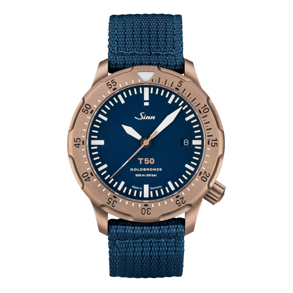Sinnが開発し特許を取得した素材ゴールドブロンズ125をケース、リューズ、ベゼルに使用したT50 GOLDBRONZE Bは、その素材の卓越した純度がダークブルーの文字盤と完璧に調和し、現代的な気品と時代を超越した美しさを放ちます。300本限定。