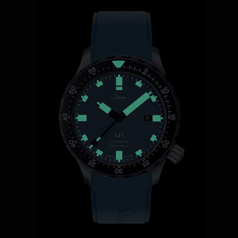 U1.B.SDRは、ドイツ海軍の212クラス非原子力潜水艦の外殻のために開発された特殊鋼Uボート・スチールのケースに、ブラック・ハード・コーティングを施した回転ベゼルとブルーダイヤルを備えた、1,000mの防水性能を持つプロフェッショナルダイバーズウォッチです。Uボート・スチールは海水耐性が優れているだけでなく、残留磁気を帯びずに反磁気性があり、ひび割れに対する耐性が高いといった特徴があります。また、回転ベゼルはセラミック以上の高硬度を実現したブラック・ハード・コーティングを施し特殊結合方式により固定されているため強い衝撃でも外れることがありません。ブルーダイヤルは真っ白で特徴的な形のインデックスとボリューム感のある針を備え、同色のシリコンストラップが全体的なブルーのイメージをさらに強調しています。
