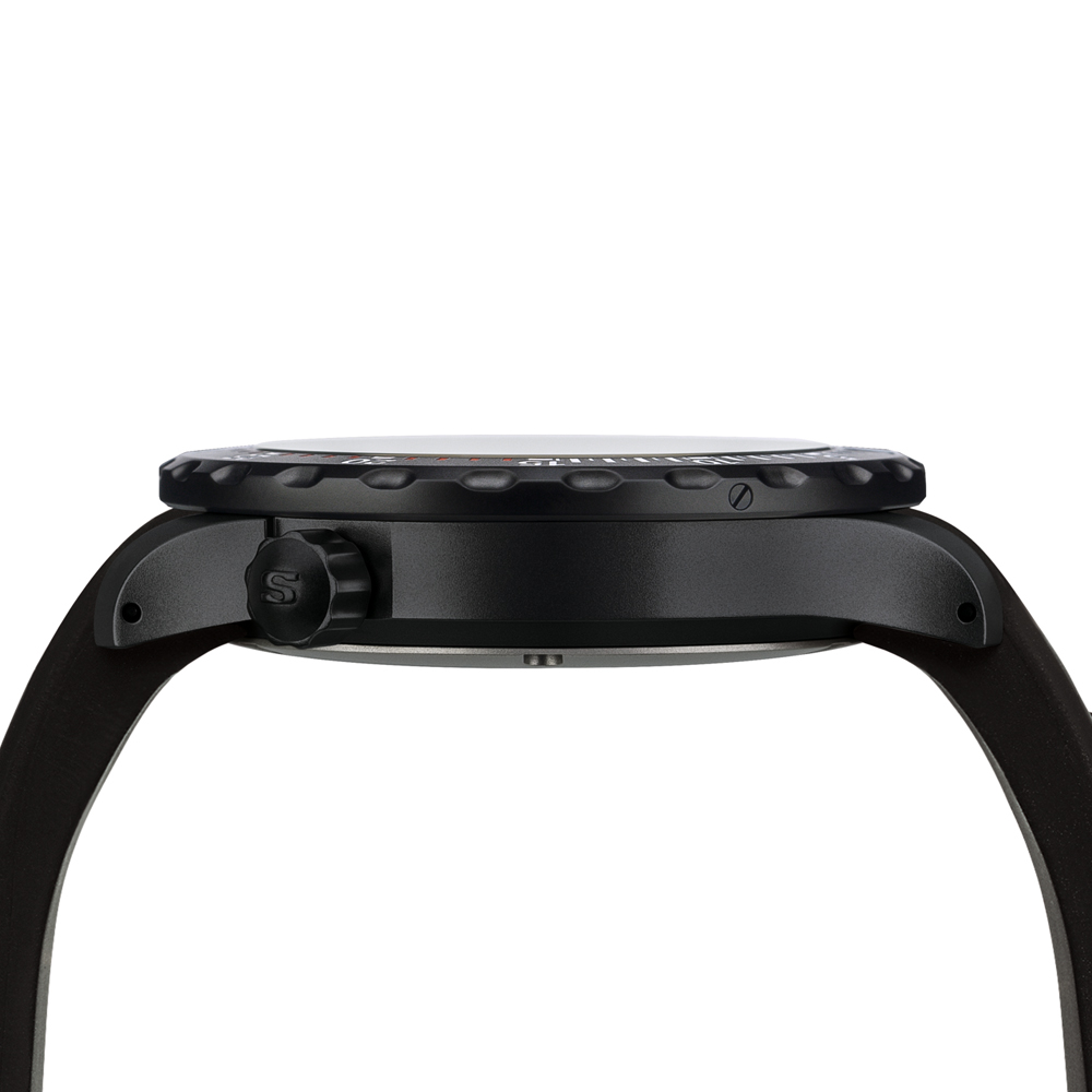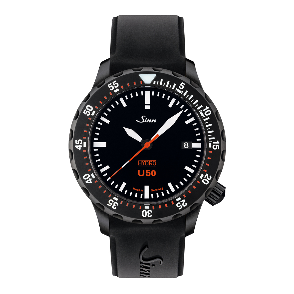 U50.HYDROシリーズのこの3つの時計はすべてが本質を追求したディスプレイを備えたデザインに重点を置いています。日常使いに最適でもあり、最も過酷な条件下でも耐えられるよう特別な素材を使用しています。ケースとリューズには、高強度で海水耐性のあるドイツ潜水艦Uボート・スチールを採用、その素材は高い強度と卓越した非磁性が特徴です。ダイビング愛好家にとっての際立つもうひとつの利点は、その卓越した海水耐性です。強い衝撃でも外れることのない特殊結合方式の回転ベゼルを採用しています。
