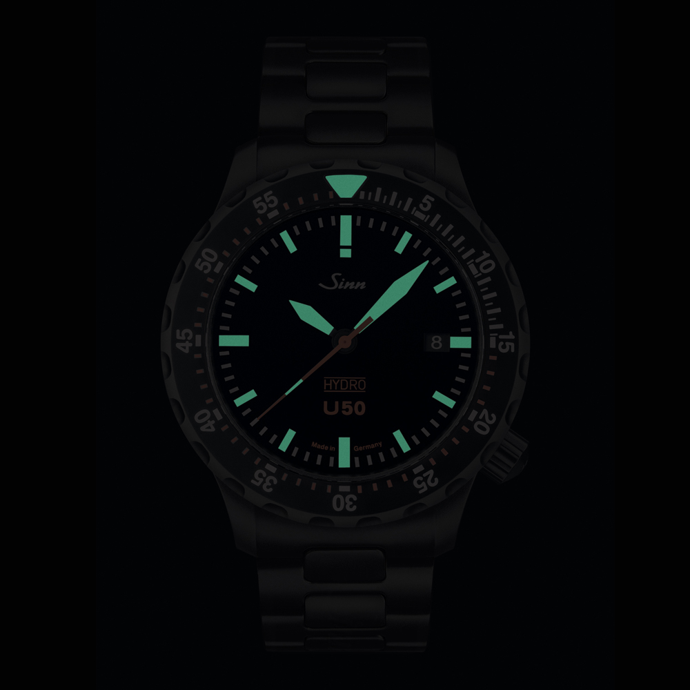 印象的な機能性と高い視認性が技術的に一体化した今、多用途で堅牢な41㎜ケース径のU50ハイドロシリーズが誕生しました。優れた特徴を持つU50.HYDRO、U50.HYDRO.SDR(ダイバーベゼルがテギメントを用いたブラック・ハード・コーティング仕様)、U50.HYDRO.S(ケースとベゼルがテギメントを用いたブラック・ハード・コーティング仕様)は、ハイドロ・テクノロジーという特徴が時計の内部に隠れているため、その驚くべき効果は水中で最も顕著に現れます。どの角度から見ても反射のない水中での視認性、曇りのなさ、そして特殊オイルの充填による水深5,000m(=500気圧)までの防水性と耐圧性など、その利点は経験豊富なダイバーやユーザーを魅了するものです。