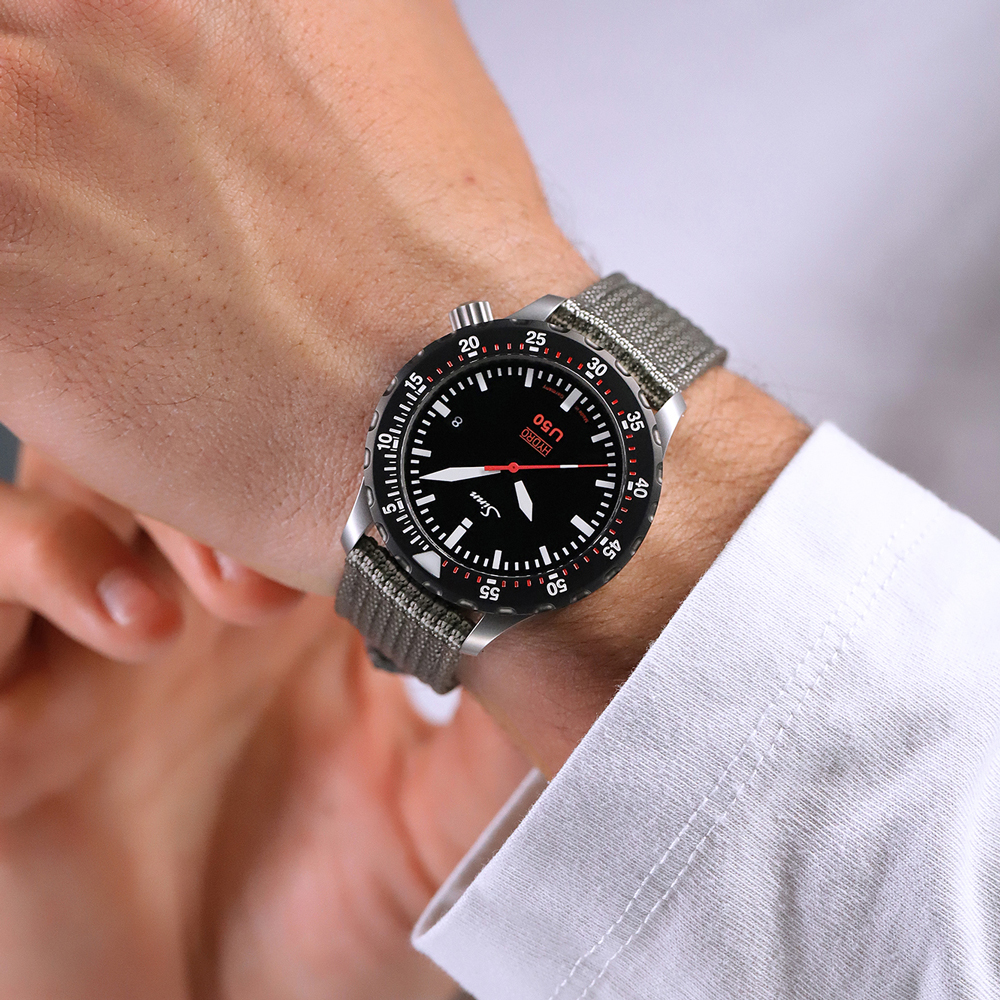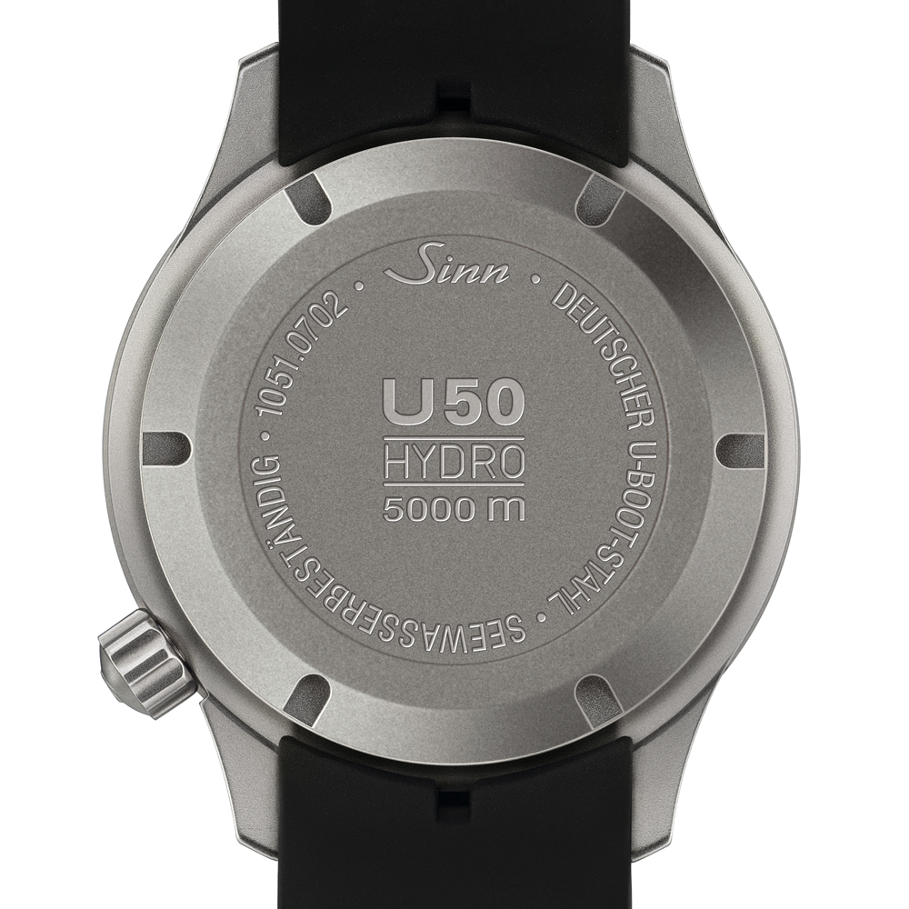 U50.HYDROシリーズのこの3つの時計はすべてが本質を追求したディスプレイを備えたデザインに重点を置いています。日常使いに最適でもあり、最も過酷な条件下でも耐えられるよう特別な素材を使用しています。ケースとリューズには、高強度で海水耐性のあるドイツ潜水艦Uボート・スチールを採用、その素材は高い強度と卓越した非磁性が特徴です。ダイビング愛好家にとっての際立つもうひとつの利点は、その卓越した海水耐性です。強い衝撃でも外れることのない特殊結合方式の回転ベゼルを採用しています。