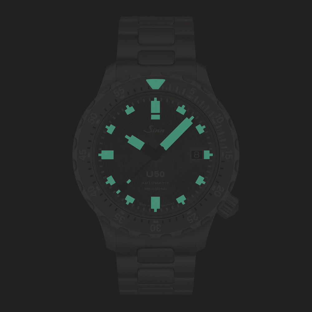 1,000本限定で製作されたU50.DSの特徴は、1点1点手作業によりスクラッチ加工されたダイヤルです。この加工は二度と同じ外観は再現されないため、それぞれの時計は唯一無二となります。不規則なパターンを持ちながら、ミニマルなダイヤルデザインのおかげで視認性を損なうことはありません。