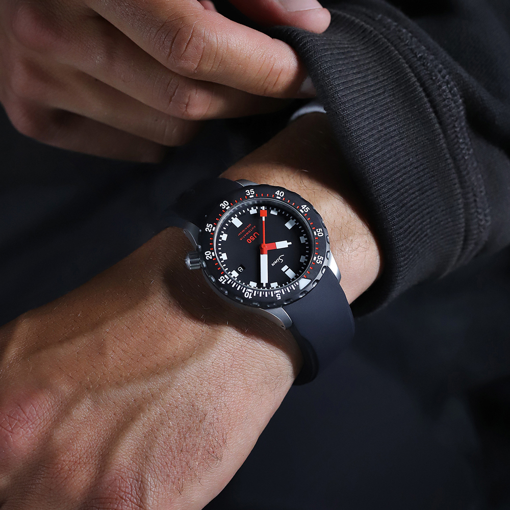 マットブラックのダイヤルに、ダイバーズウォッチにとって必要不可欠な要素のみに集中したシンプルさが目を引きます。ケースとリューズには他のUシリーズ同様に、海水耐性に強いドイツ潜水艦の鋼鉄であるUボート・スチールを採用しています。このタイプのスチールは、高い強度と非磁性特性だけでなく、海水への高い耐性でも際立っています。逆回転防止ベゼルは特殊結合方式によりケースに取り付けられ、表面を硬化させるテギメント・テクノロジーを使用したブラック・ハード・コーティングを施しています。手の甲に当たらないようリューズは4時位置に装備しています。