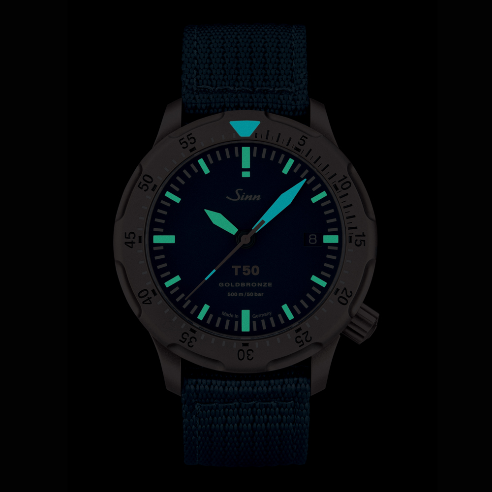 Sinnが開発し特許を取得した素材ゴールドブロンズ125をケース、リューズ、ベゼルに使用したT50 GOLDBRONZE Bは、その素材の卓越した純度がダークブルーの文字盤と完璧に調和し、現代的な気品と時代を超越した美しさを放ちます。300本限定。