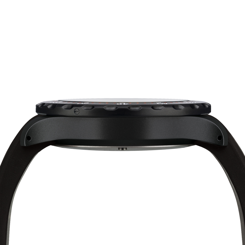 表面を硬化させるテギメント・テクノロジーの採用で材質の硬度が高くなり、外部からの傷を効果的に防止します。4時位置に配置したリューズは、激しい運動中などでもリューズが手に当たることを防ぎます。